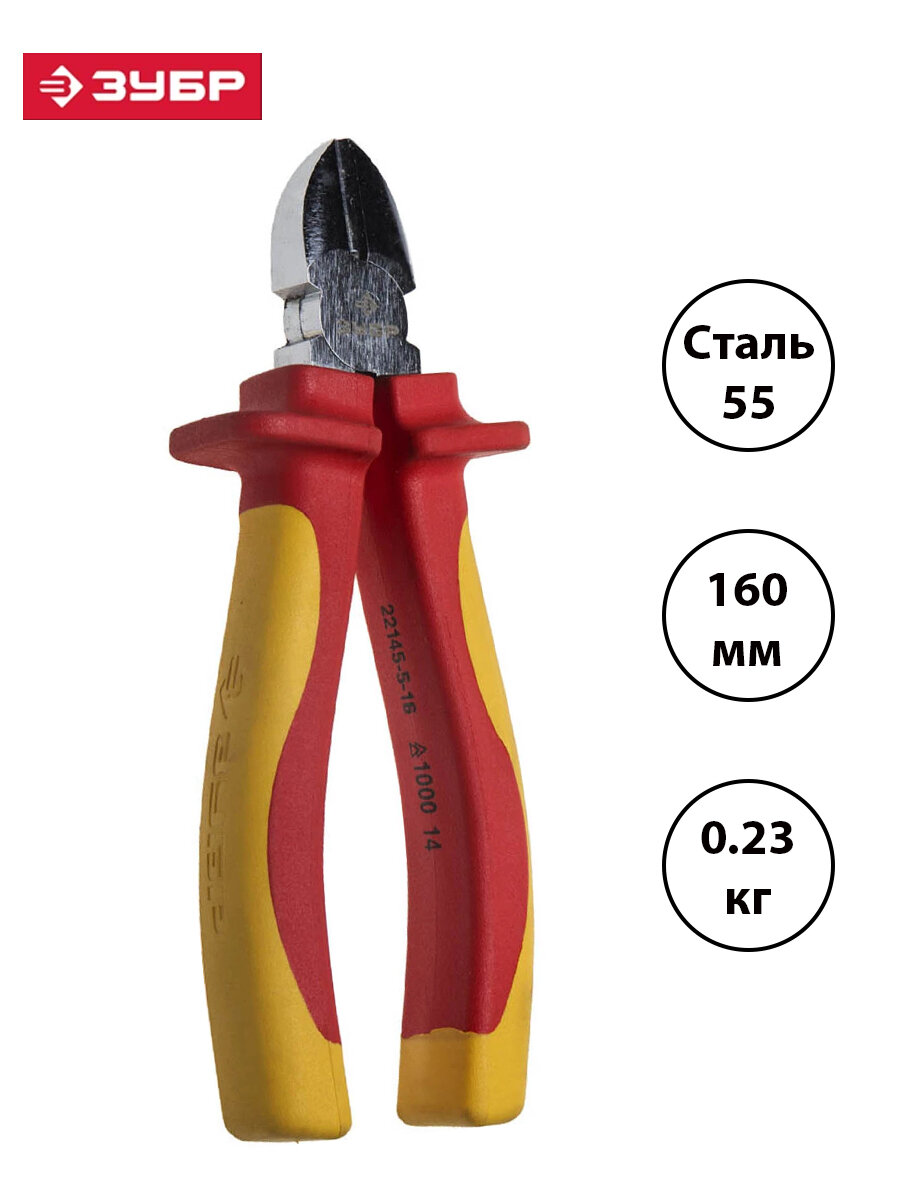 Бокорезы Зубр Профессионал "ПрофиЭлектрик", диэлектрические, двухкомп маслобензостойкая рукоятка, высоковольтные до ~1000В, 160мм, 22145-5-16