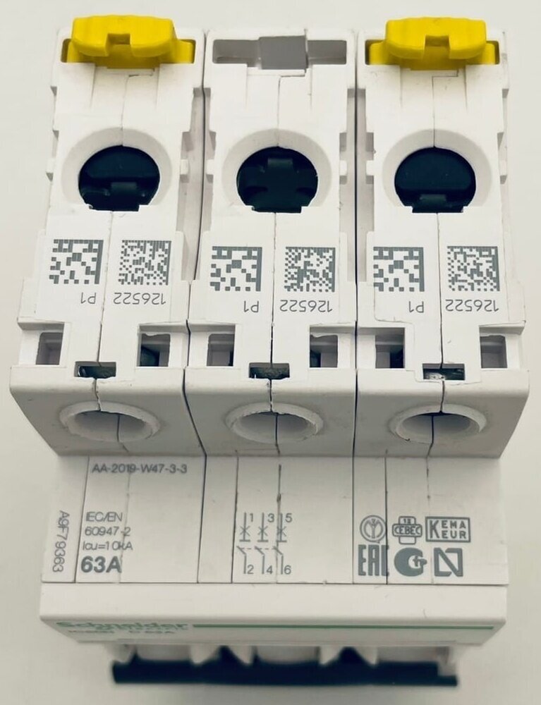 СохранитьВыключатель автоматический трехполюсный 63А С iC60N 6кА A9F79363 Schneider Electric интересное: