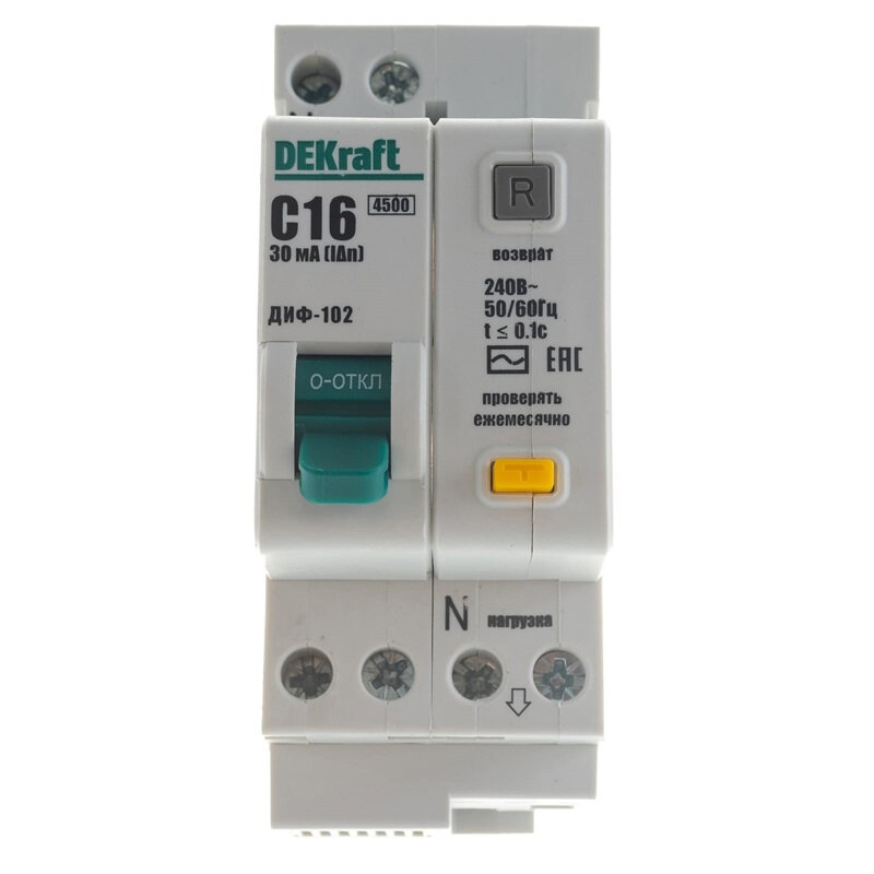 DEKraft ДИФ-102 Дифференциальный автоматический выключатель 1Р+N 16А 30мА тип AC (С) 4,5кА