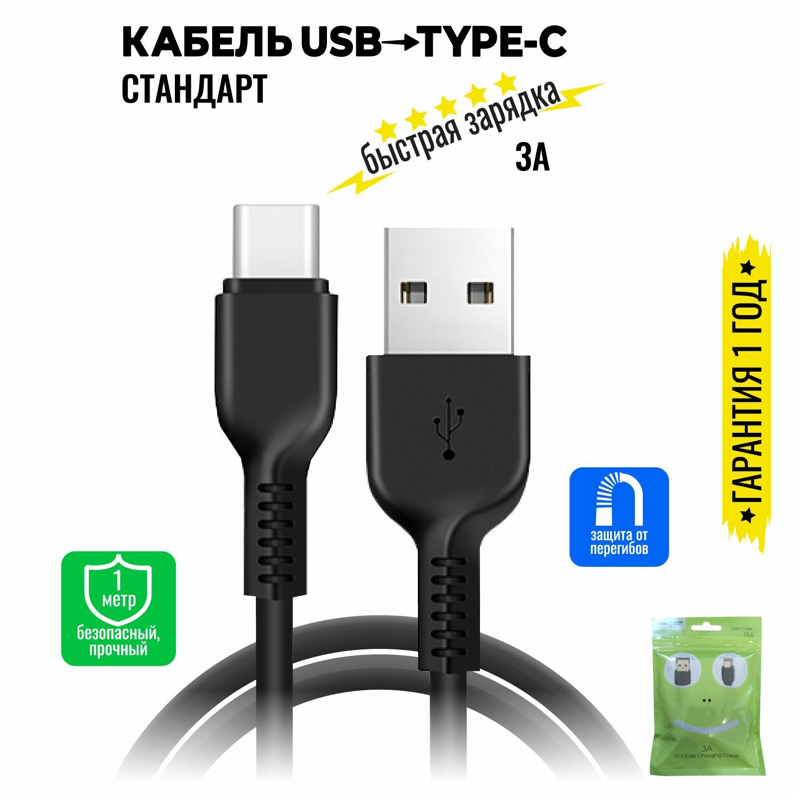 Кабель USB Type C, быстрая зарядка, 1 метр, передача данных / провод тип с для смартфона, шнур для телефона / Hoco. X13