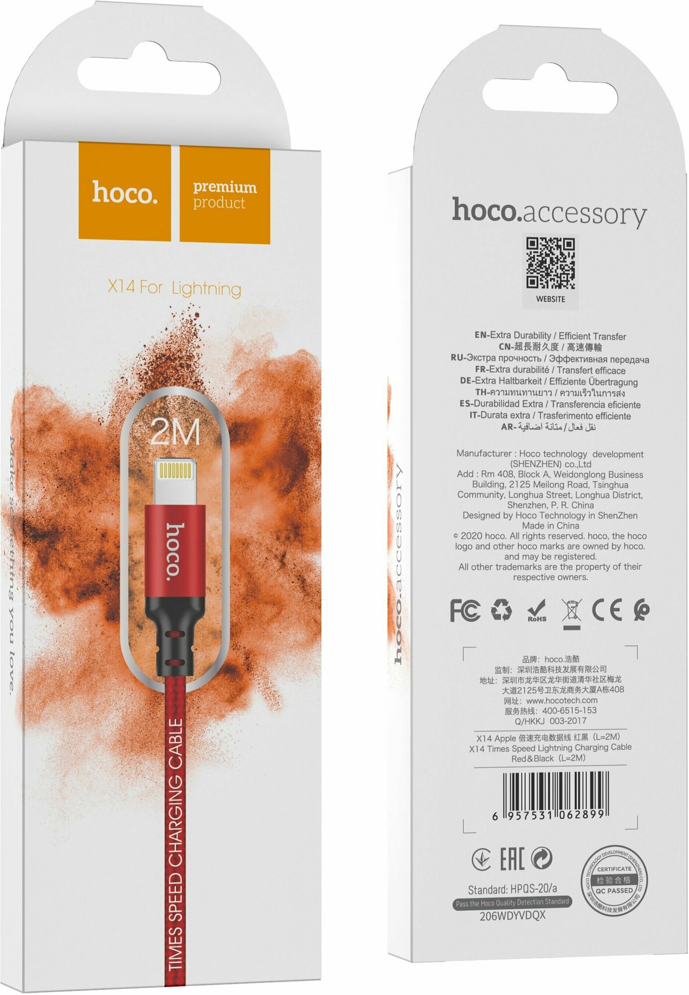 Кабель USB Hoco X14 Times speed Lightning, 2 м, красный