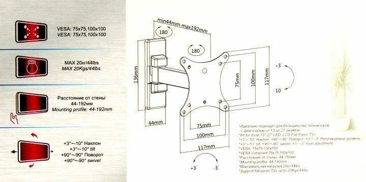 | Плюсы: | Быстрый монтаж. Выдержал нагрузку TV 24.Прост в использовании и установке. |