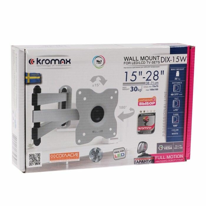 Кронштейн Kromax DIX-15 Белый, Кр. стал. наст. для TV 10"-28", max 30 кг, 5 ст св., нак. ±15°, пов. 180°, от ст. 48-377 мм, max VESA 100x100