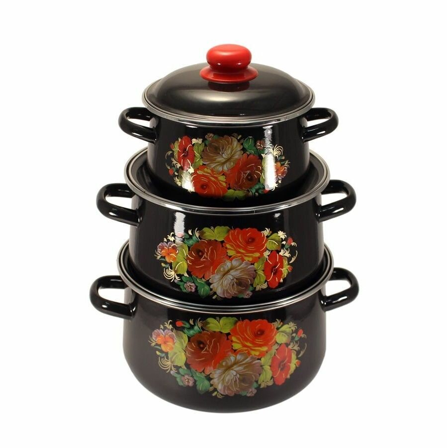 Купить Набор посуды эмаль Стальэмаль "Жостово" 1С408, 3 предмета, 2л.; 4л.; 5,5л., крышка эмаль, ручки литые, с декором, черный