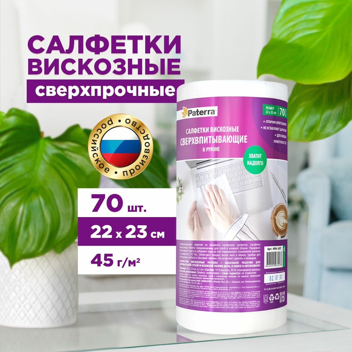 Салфетки вискозные, сверхвпитывающие, PATERRA, 70 шт. в рулоне, 22*23 см