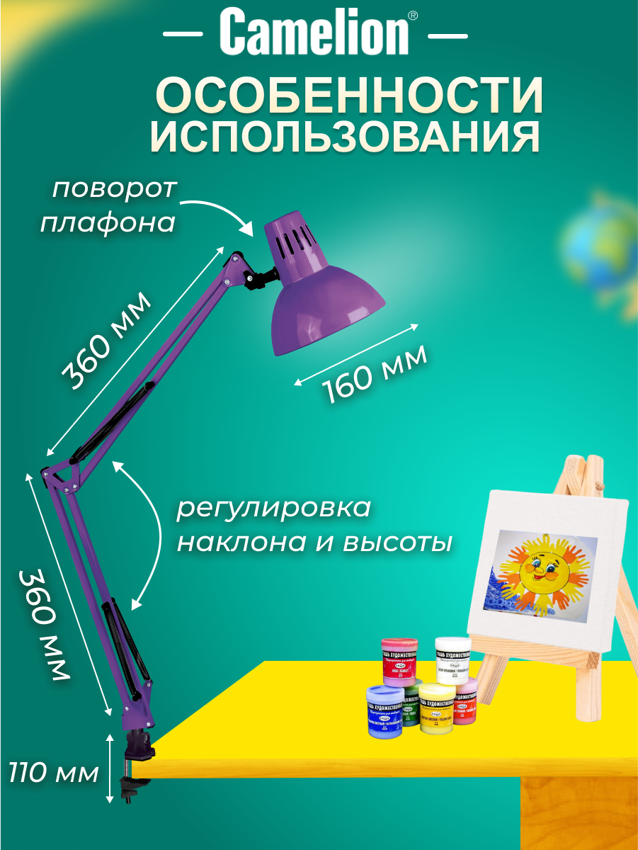 Лампа офисная Camelion Light Solution KD-312, E27, 40 Вт, фиолетовый
