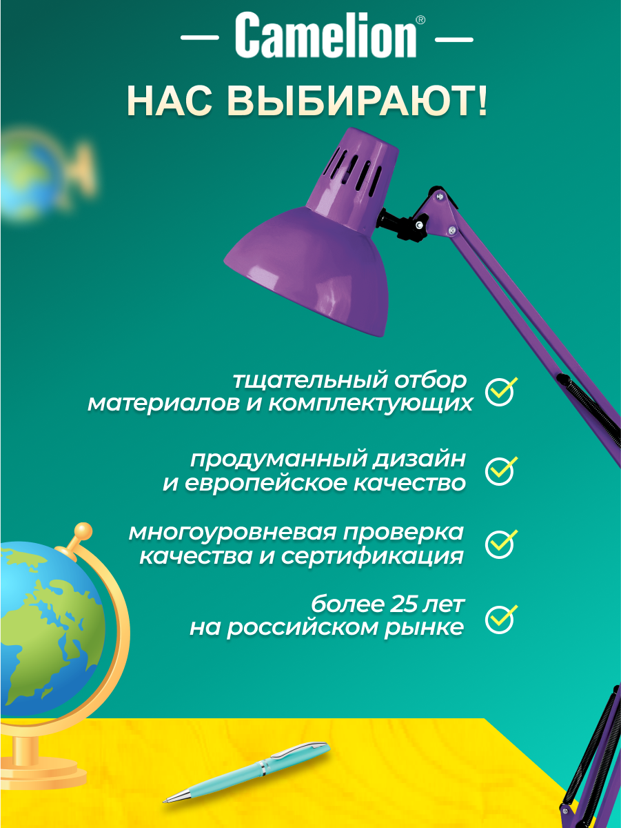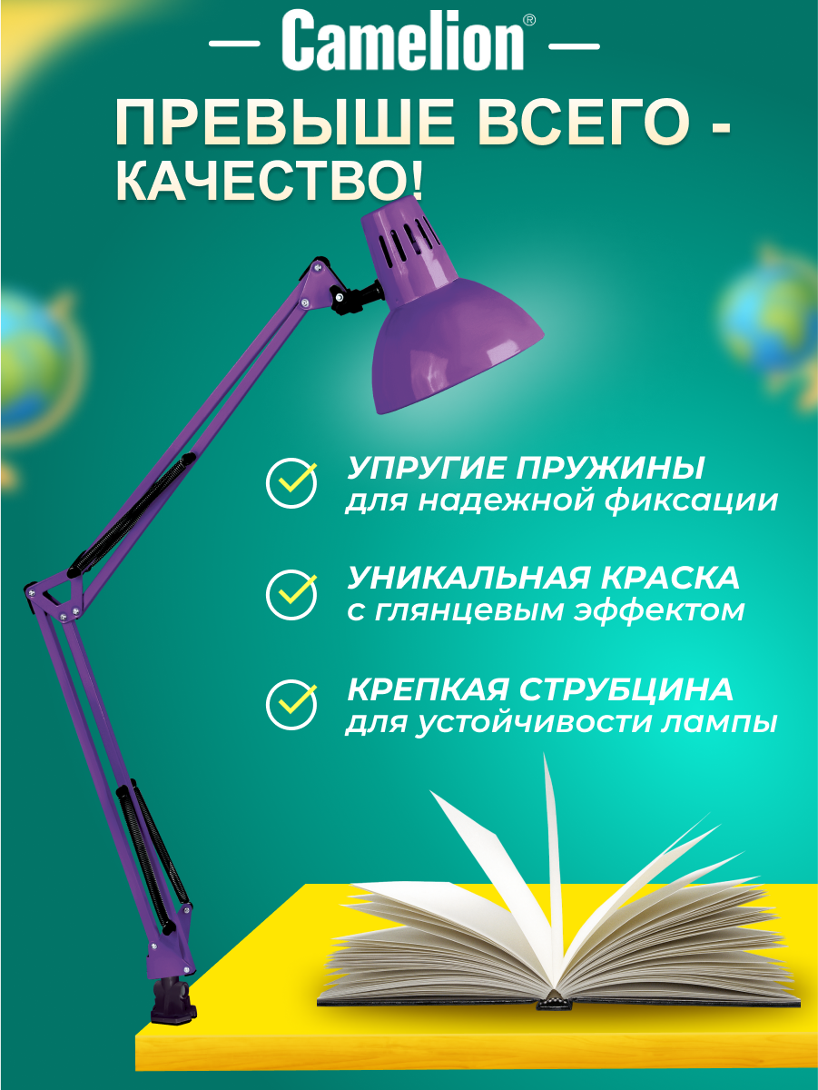 СохранитьCamelion KD-312 C12 фиолетовый (Светильник настольный,230V 40...60W, E27) интересное: