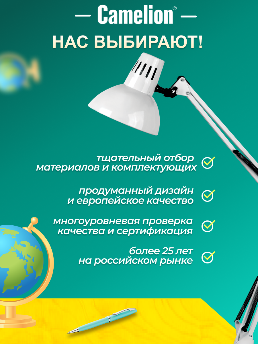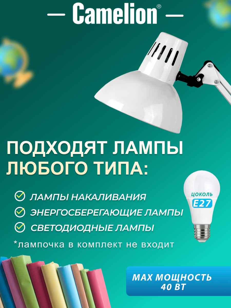 Лампа офисная Camelion Light Solution KD-312, E27, 60 Вт, цвет арматуры: белый, цвет плафона/абажура: белый
