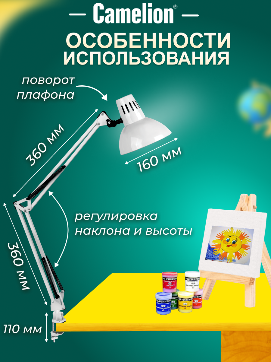 Светильник Camelion KD-312 C01 (5764) настольный, на струбцине, E27, белый, 60 Вт