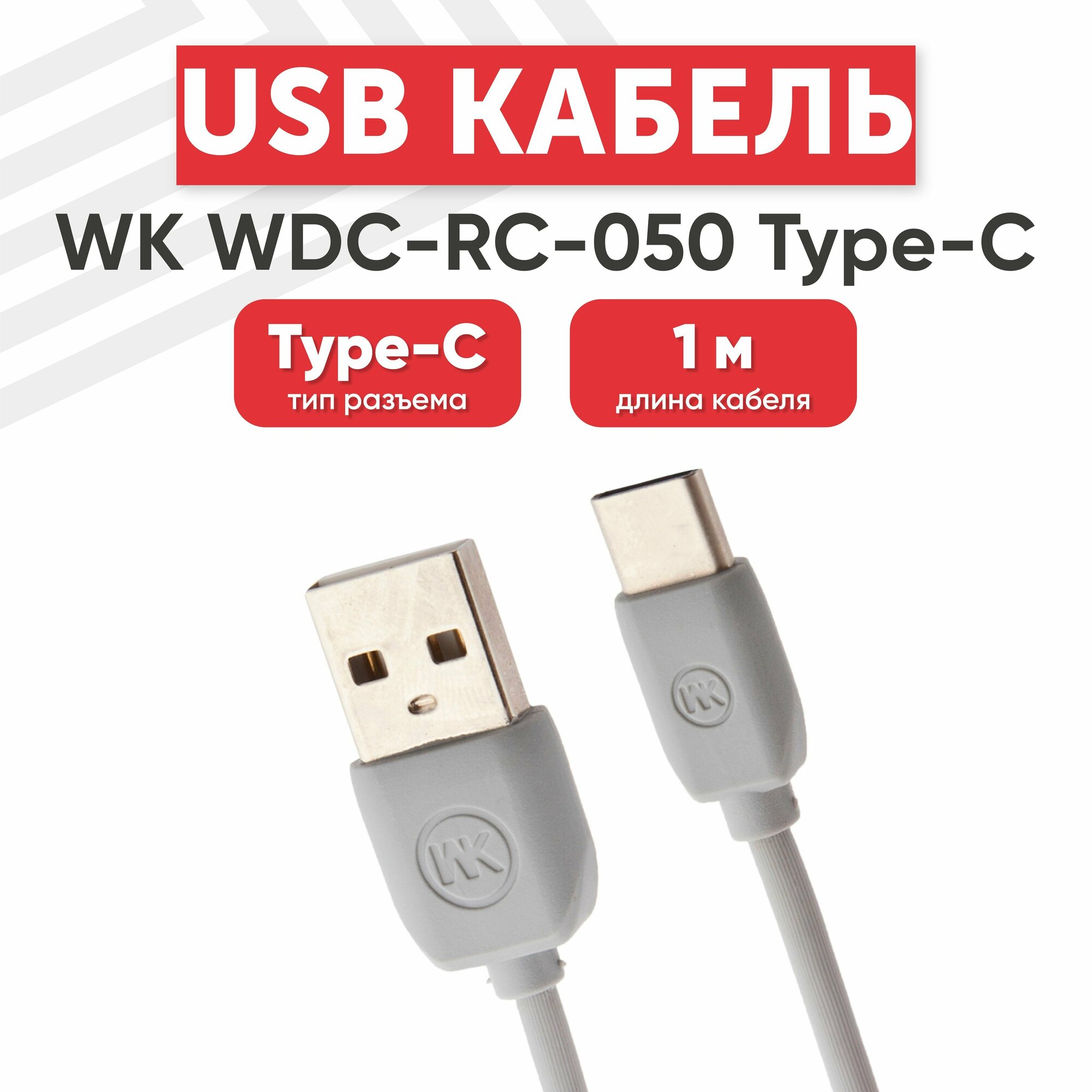 USB кабель WK WDC-RC-050a для зарядки, передачи данных, Type-C, 2.1А, 1 метр, TPE, серый интересное: