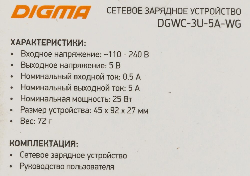 зарядное устройство DIGMA DGWC-3U-5A-WG