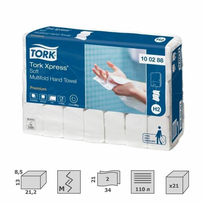 Полотенца бумажные для держателя 2-слойные Tork Н2 Premium Xpress Multifold, листовые М-сложения, 21 пачка по 110 листов (100288)