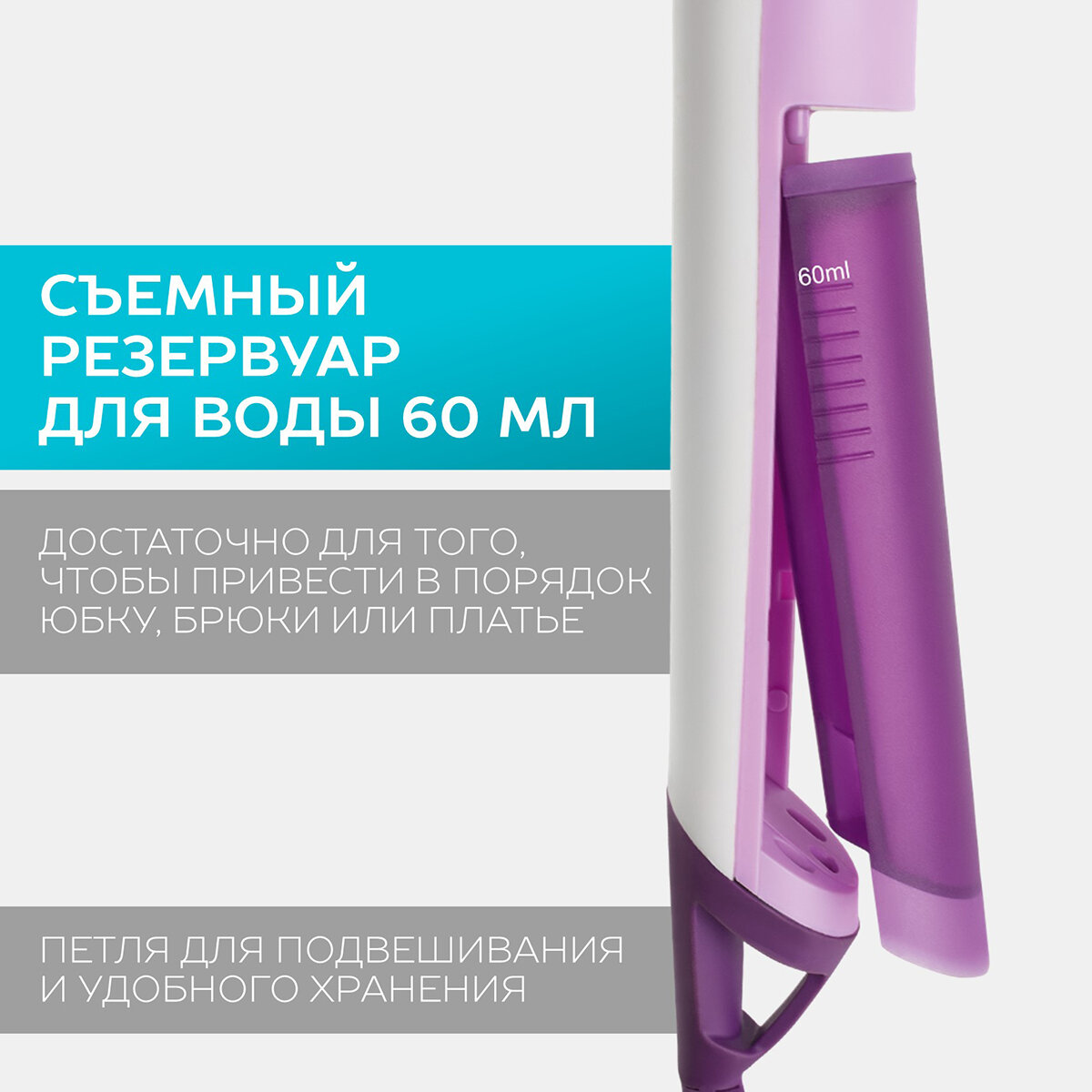 | Плюсы: | Ловко лежит в руке, бачок для воды съемный, быстро начинает парить, длинный шнур, защита от перегрева. |