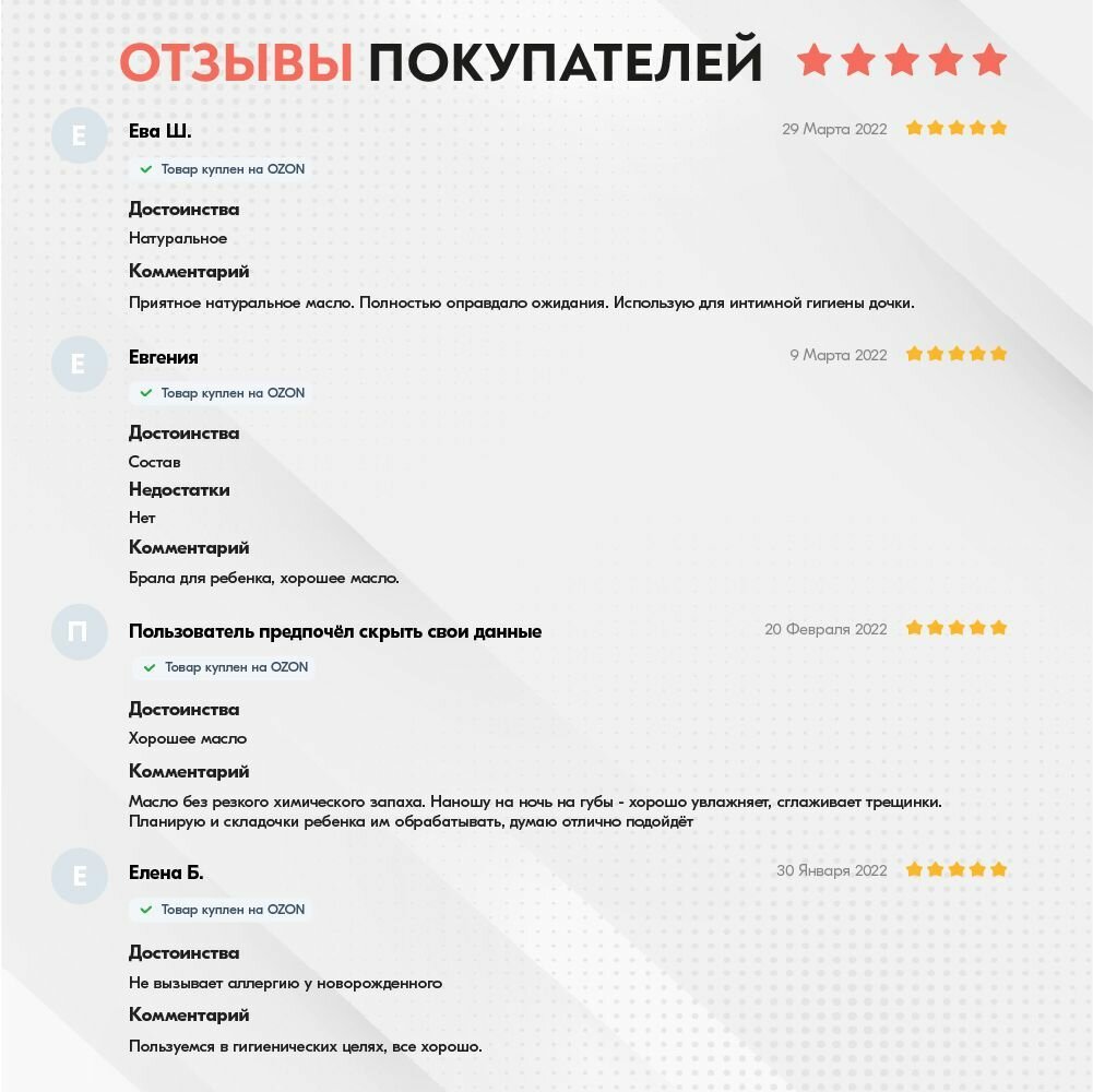 | Плюсы: | Очень хорошее масло: натуральный состав, приятный запах, для массажа идеально. Заживляет ранки на коже. |