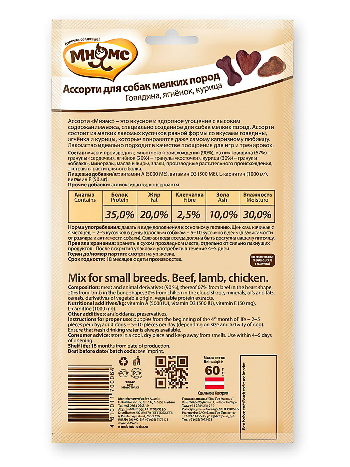 Мнямс лакомство для взрослых собак малых пород, ассорти из говядины, ягненка и курицы 60 гр