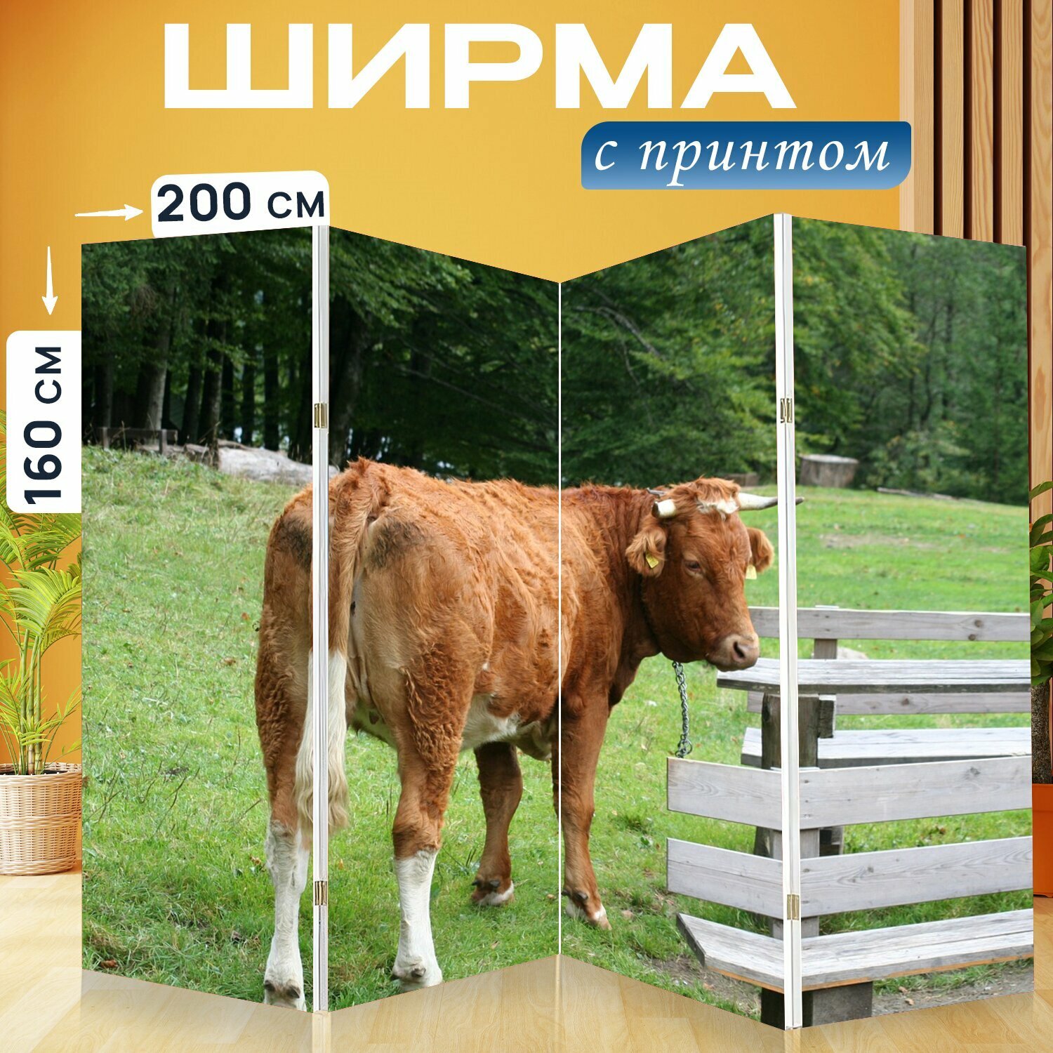 Ширма "Корова, пастбище, коричневый" перегородка для зонирования комнаты с принтом 280x175 см. на холсте