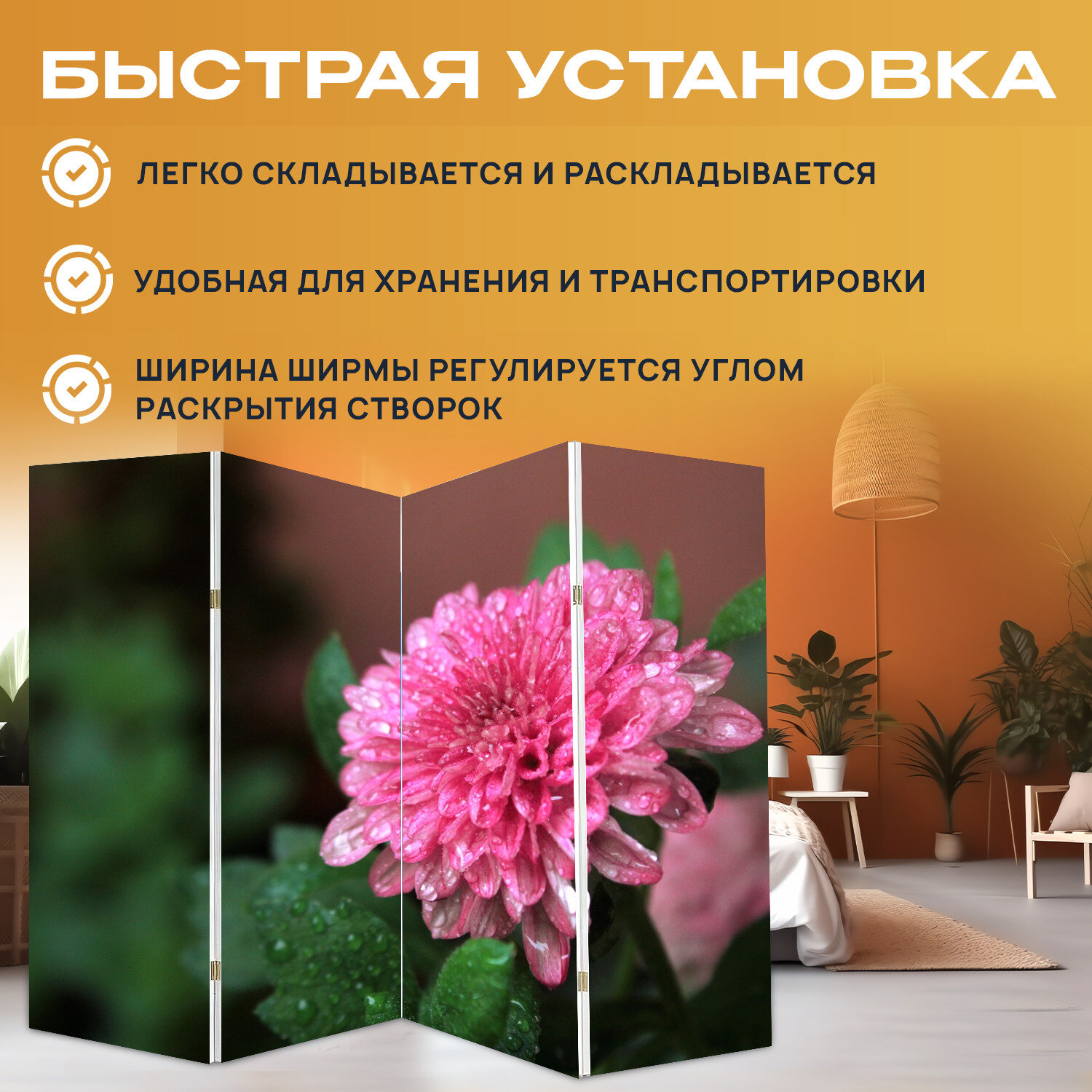 Ширма "Хризантема, цветок, роса" раскладная перегородка для зонирования с принтом на холсте интересное: