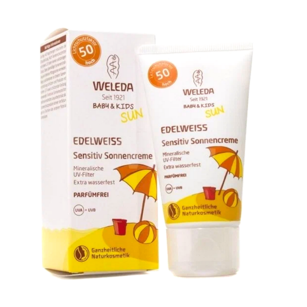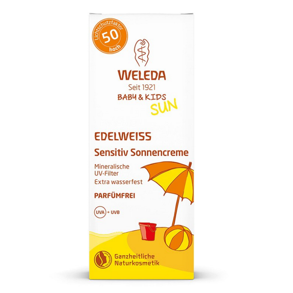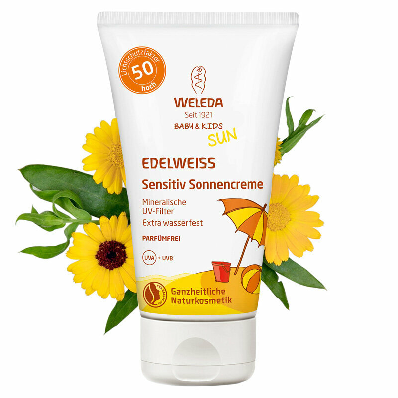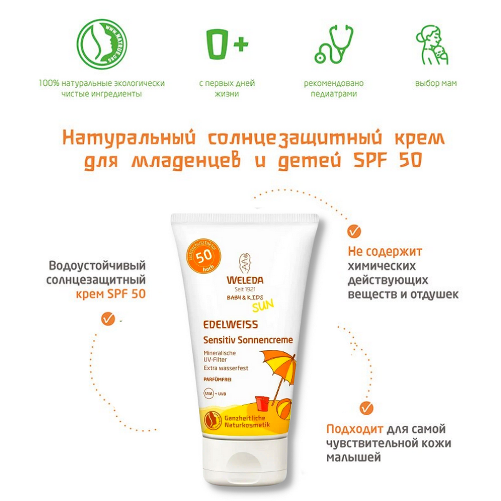 Weleda Солнцезащитный крем для младенцев и детей SPF 50 Weleda Baby & Kids Sun Edelweiss, 50 мл. надежная защита нежной чувствительной кожи от солнечных ожогов и негативного воздействия внешней среды.
