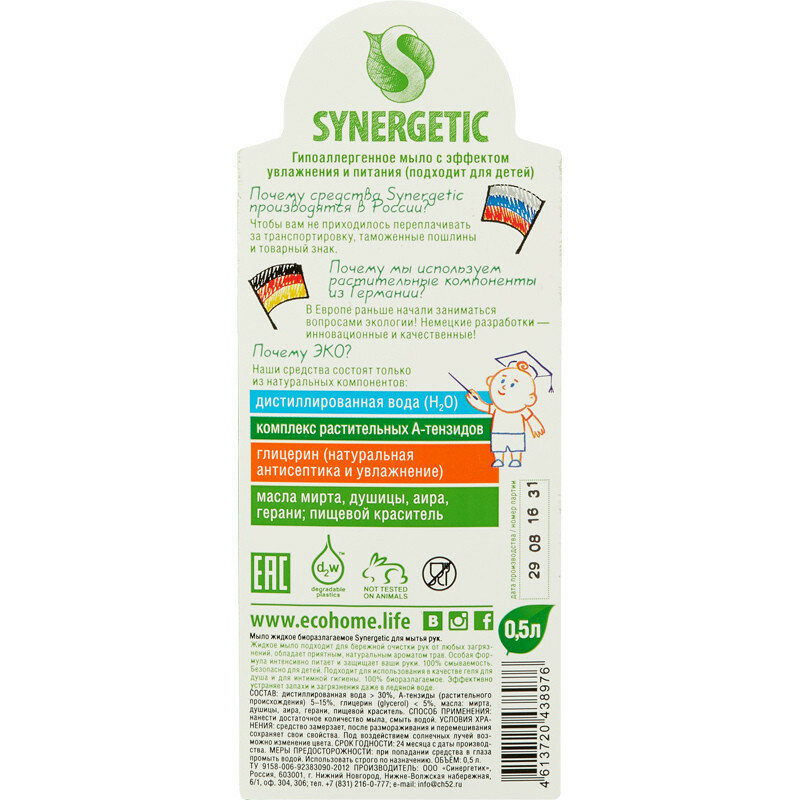 Synergetic Мыло жидкое Synergetic, "Луговые травы", биоразлагаемое, гипоаллергенное, с дозатором, 500 мл