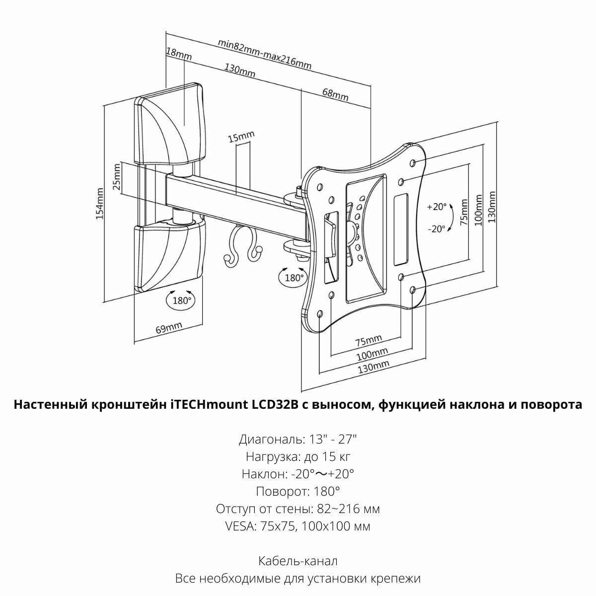 Кронштейн на стену iTech LCD32B черный наклонно-поворотный