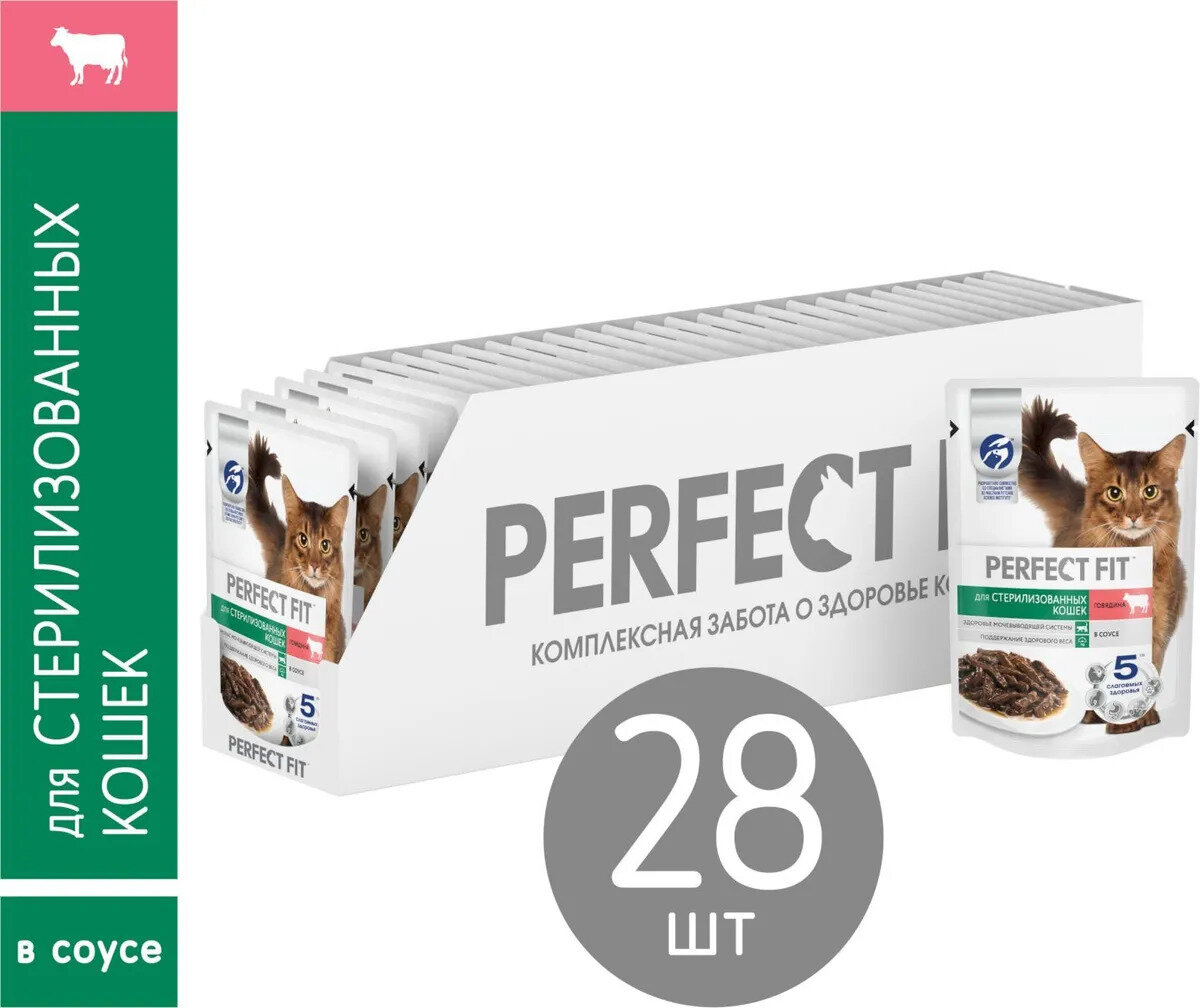 Купить Perfect Fit влажный корм для стерилизованных кошек с говядиной в соусе, в паучах - 75 г х 28 шт