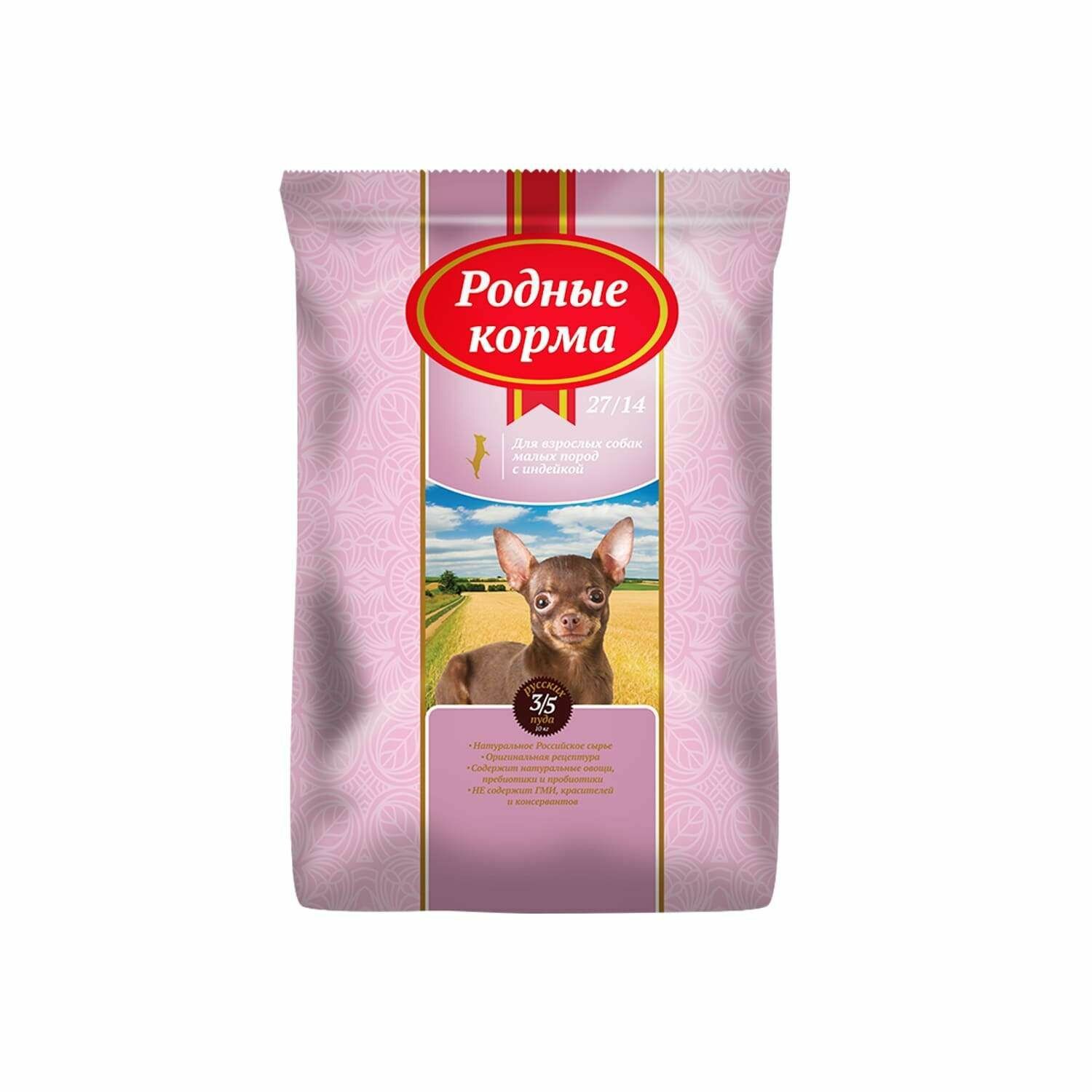 Родные корма 27/14 3/5 пуда 10 кг сухой корм для взрослых собак мелких пород с индейкой