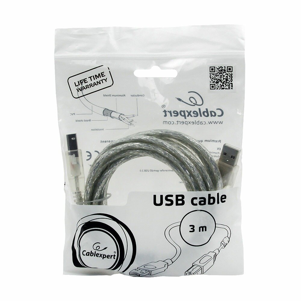 Кабель USB 2.0 Pro, AM/BM, экран, ферритовое кольцо, 3 м, прозрачный, Cablexpert