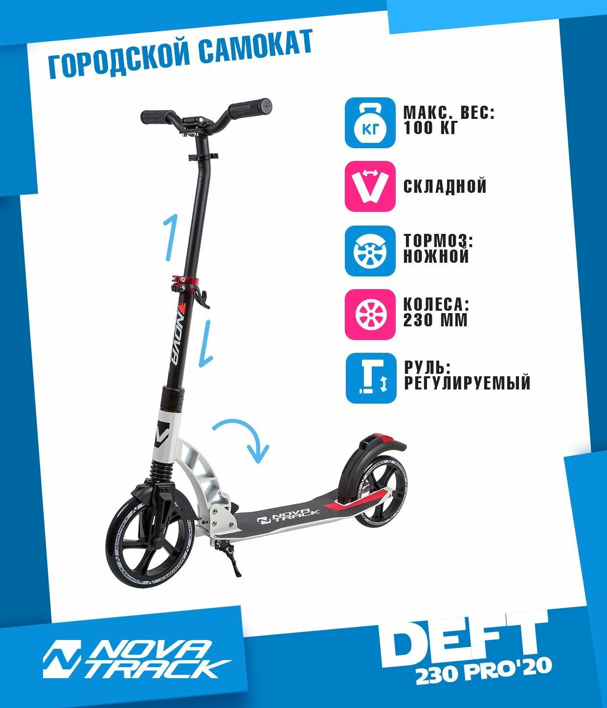 Самокат Novatrack Deft 230 PRO'20, белый 230FS.DEFT.BWT9