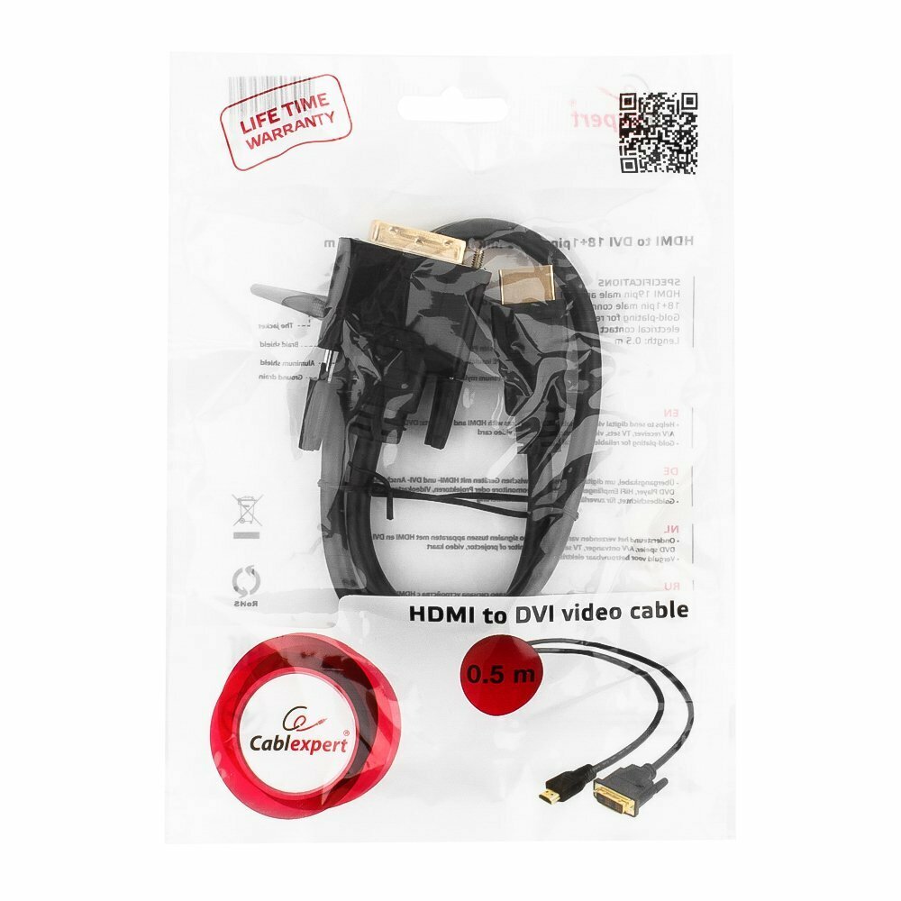 Купить Кабель HDMI-DVI Gembird/Cablexpert CC-HDMI-DVI-0.5M, 19M/19M, 0.5м, single link, черный, позол.разъемы, экран, пакет