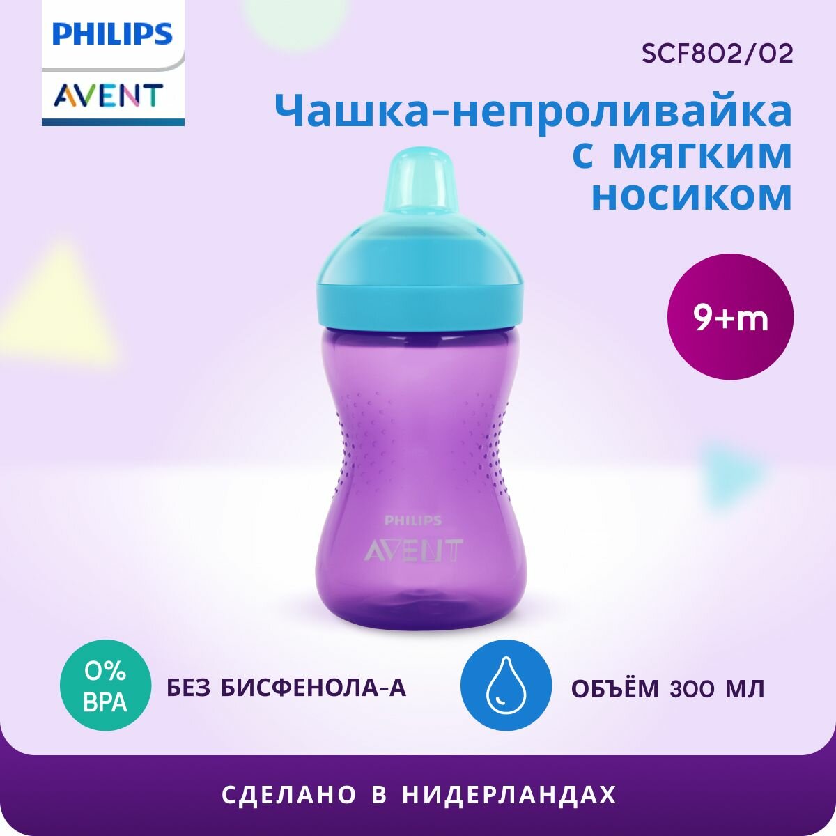 Чашка-непроливайка с мягким носиком Philips AVENT SCF802/02, 300мл, фиолетовый, с 9 мес