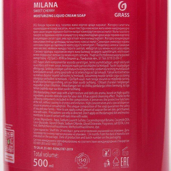 Жидкое крем-мыло MILANA спелая черешня увлажняющее с дозатором флакон 500 мл GRASS 126400