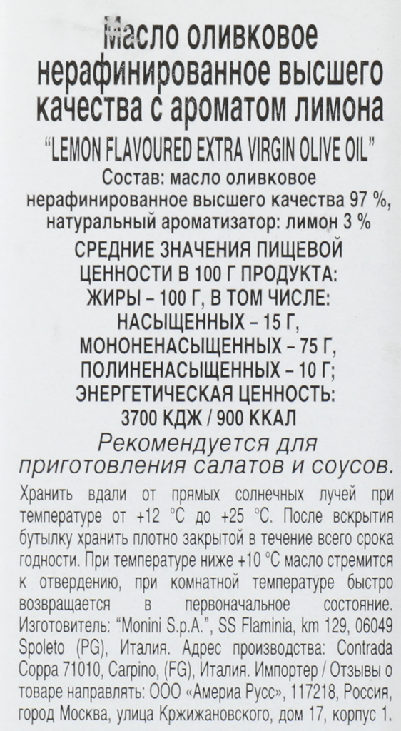 Купить Масло оливковое MONINI Limone с ароматом лимона, Extra Vergine, 250мл