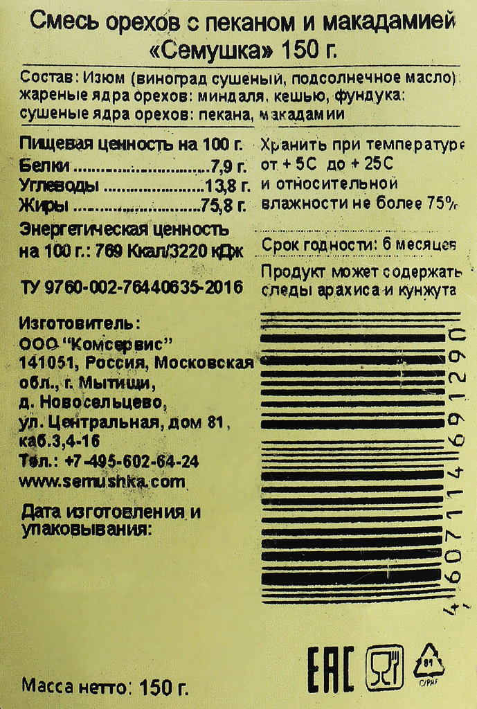 Смесь ореховая семушка жареная с пеканом и макадамией, 150г интересное: