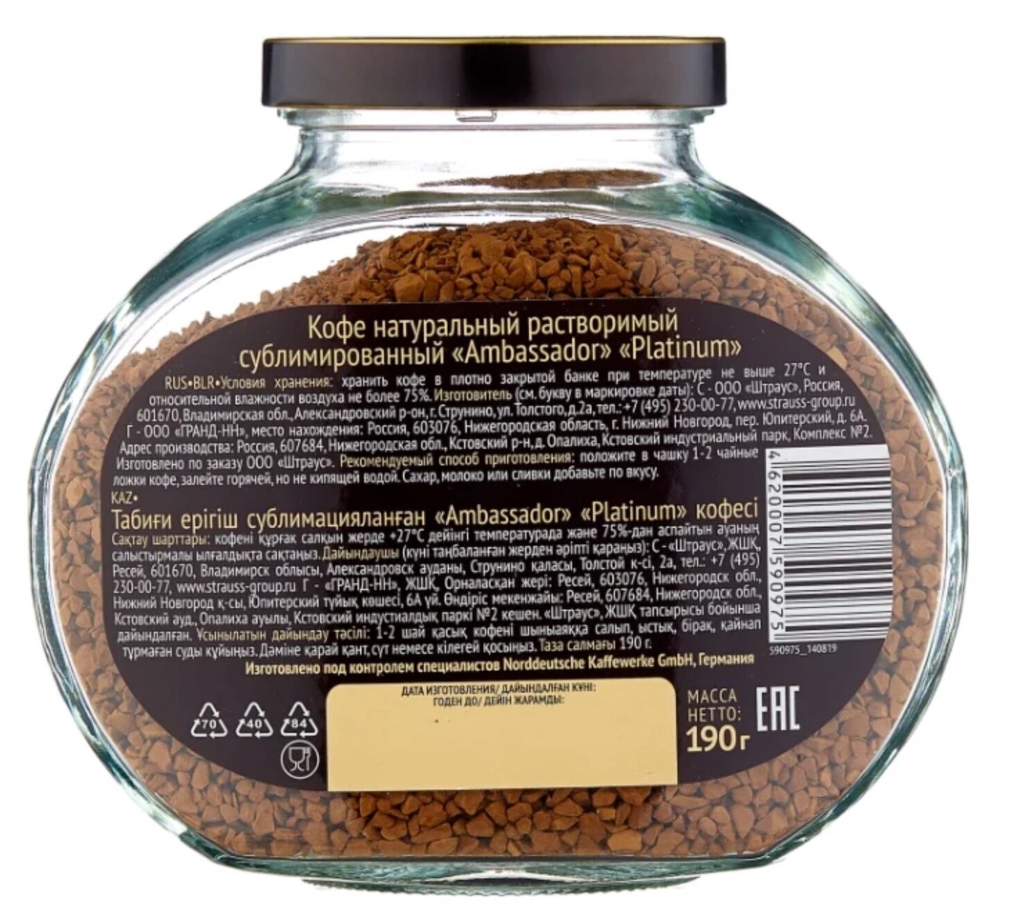 Кофе растворимый AMBASSADOR "Platinum", сублимированный, 190 г, стеклянная банка
