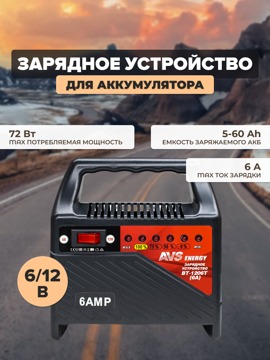 Зарядное устройство AVS BT-1206T для автомобильного аккумулятора (6A) 6/12V, A78471S