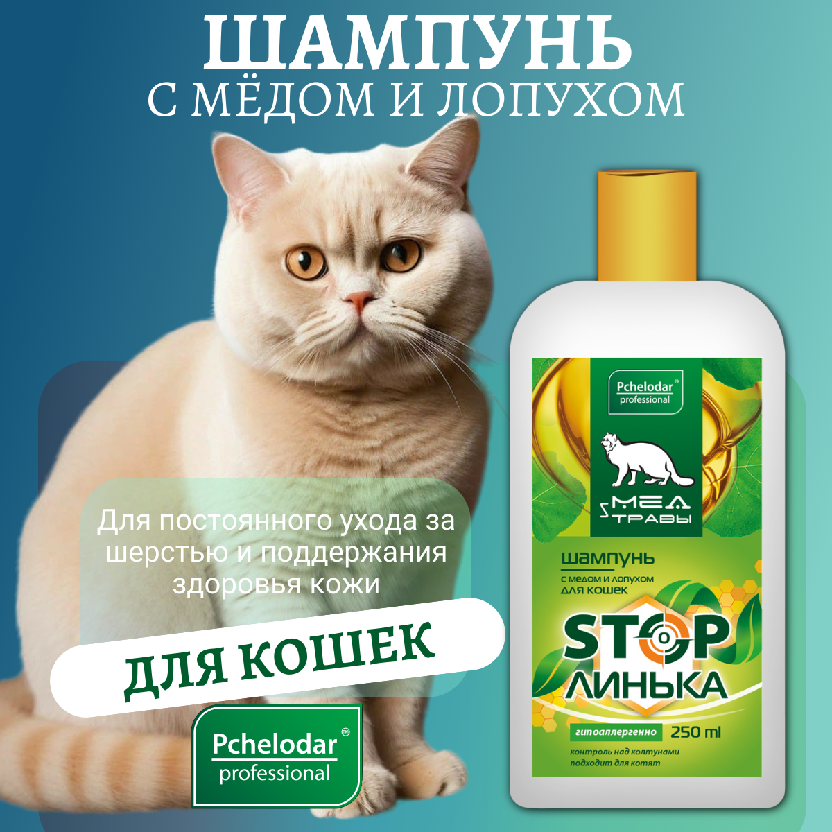 Шампунь для кошек PCHELODAR с медом и экстрактом лопуха (250 мл)