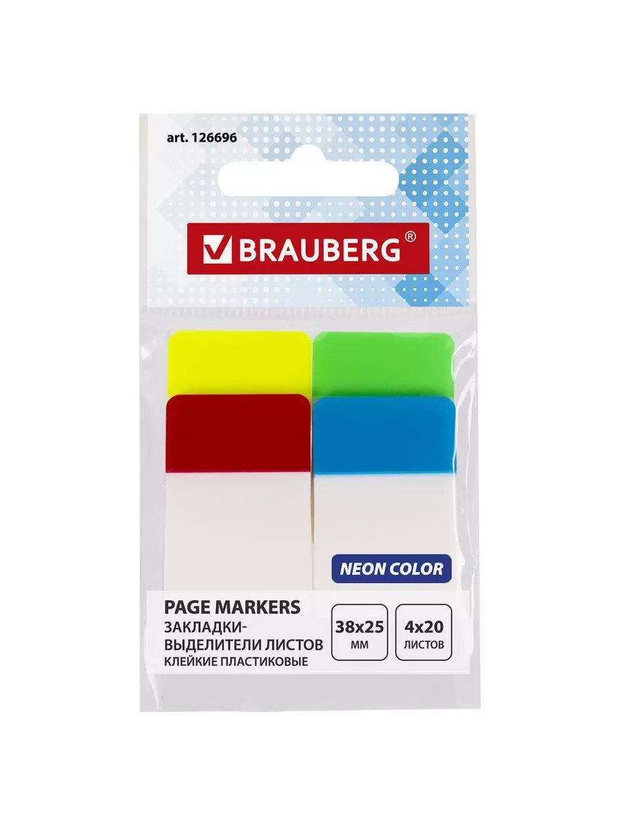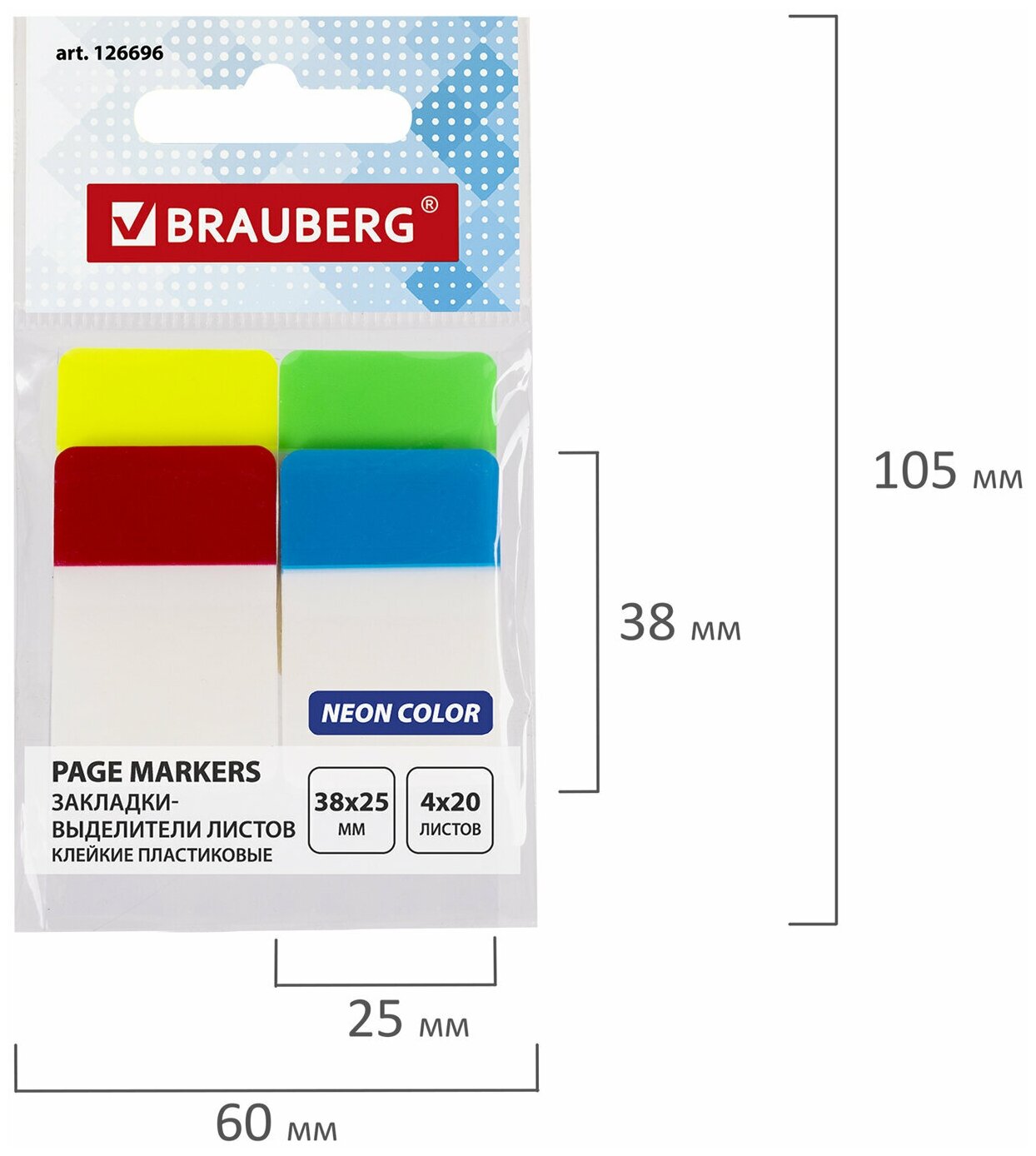 Закладки-выделители листов клейкие BRAUBERG пластиковые, 38х25 мм, 4 цвета х 20 листов, 126696