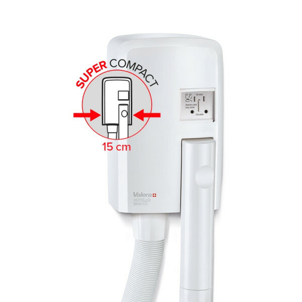 Фен настенный Valera Hospitality Hotello Super AC Shaver (832.02/RT), мощность 1400 Вт, автоматическое включение и выключение, супербезопасный, электрический таймер, розетка для бритвы, суперкомпактный, растягивающийся шланг, лёгкий монтаж