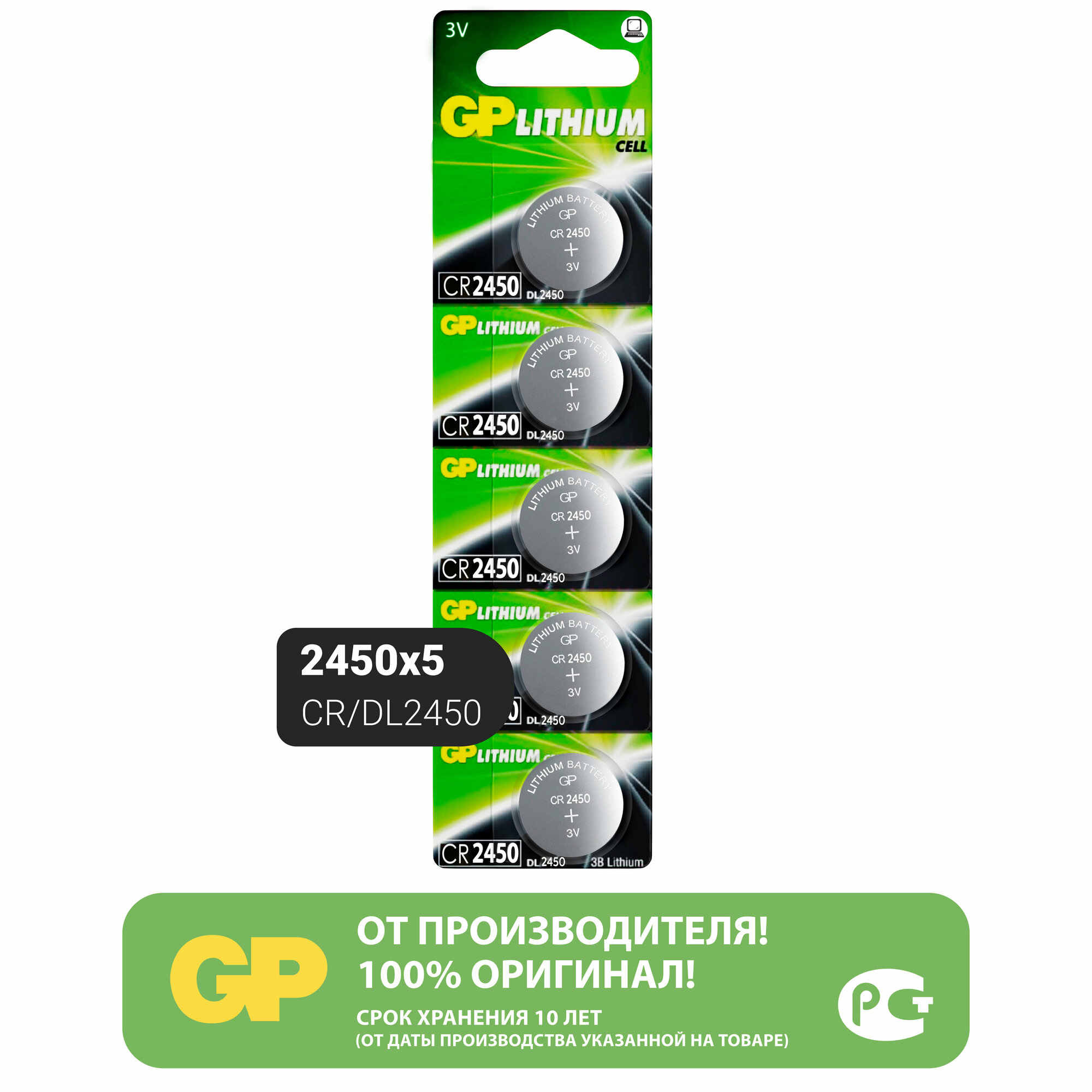 Литиевые дисковые батарейки GP Lithium CR2450 - 5 шт., каждая в своем отрывном блистере