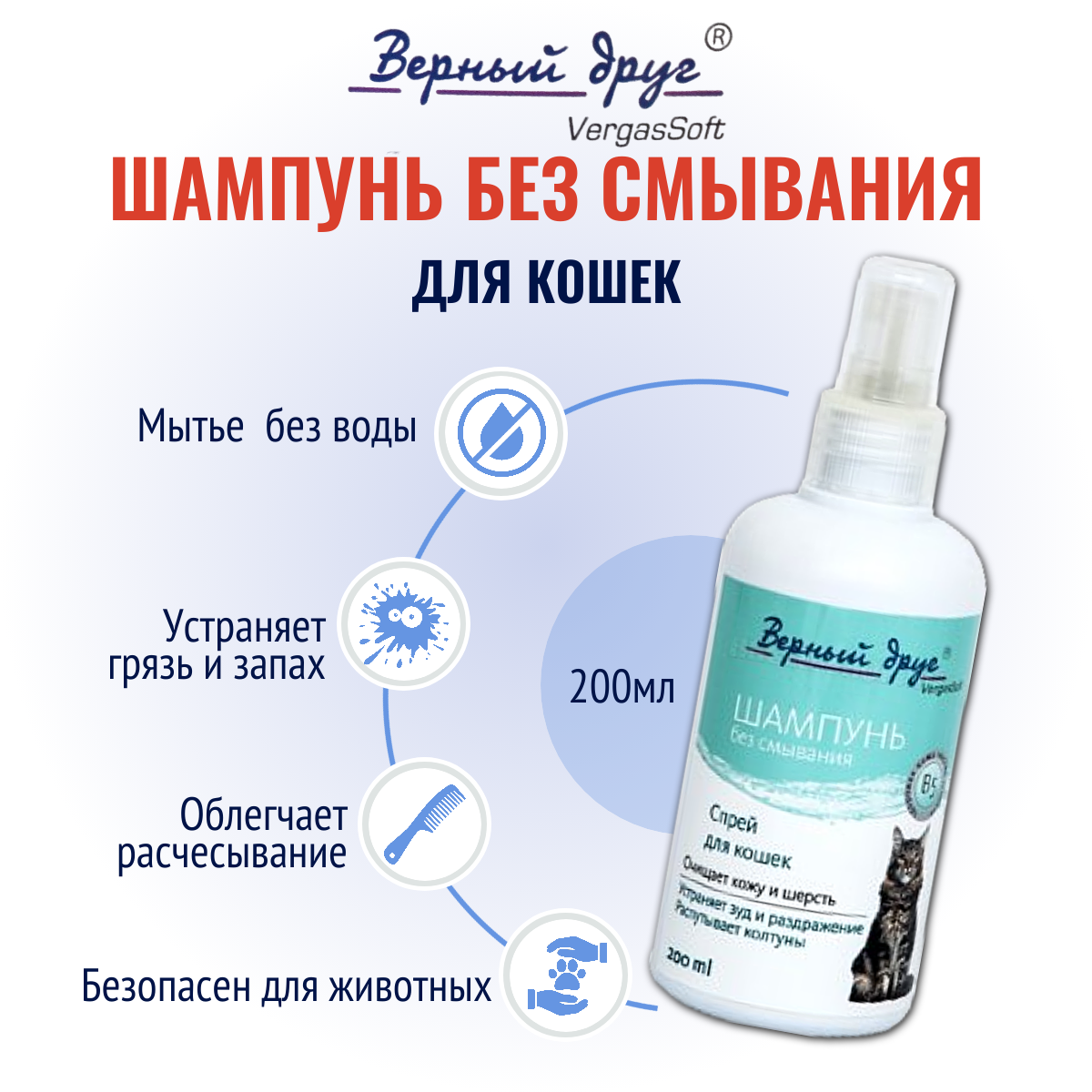 Шампунь Верный друг без смывания для кошек , 200 мл