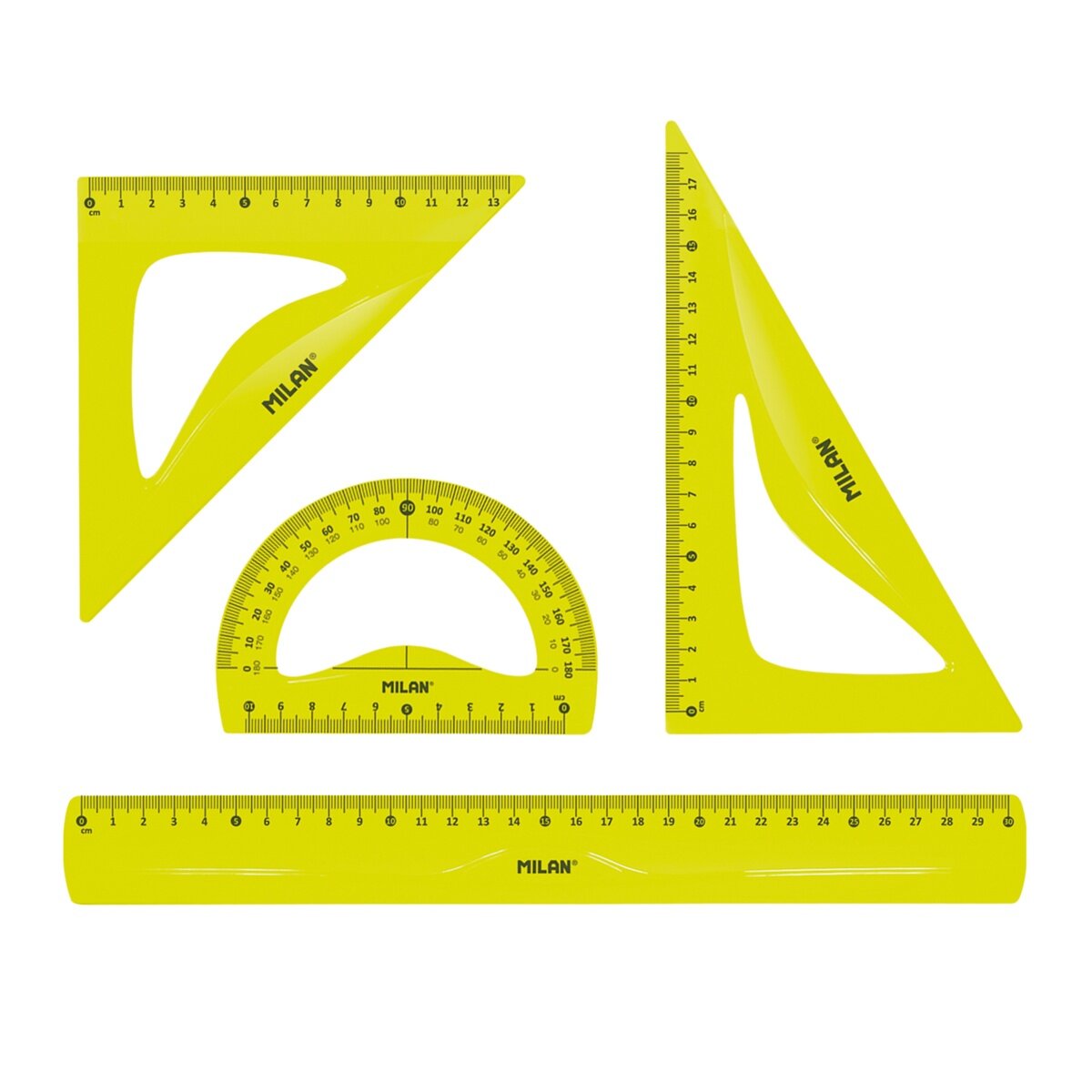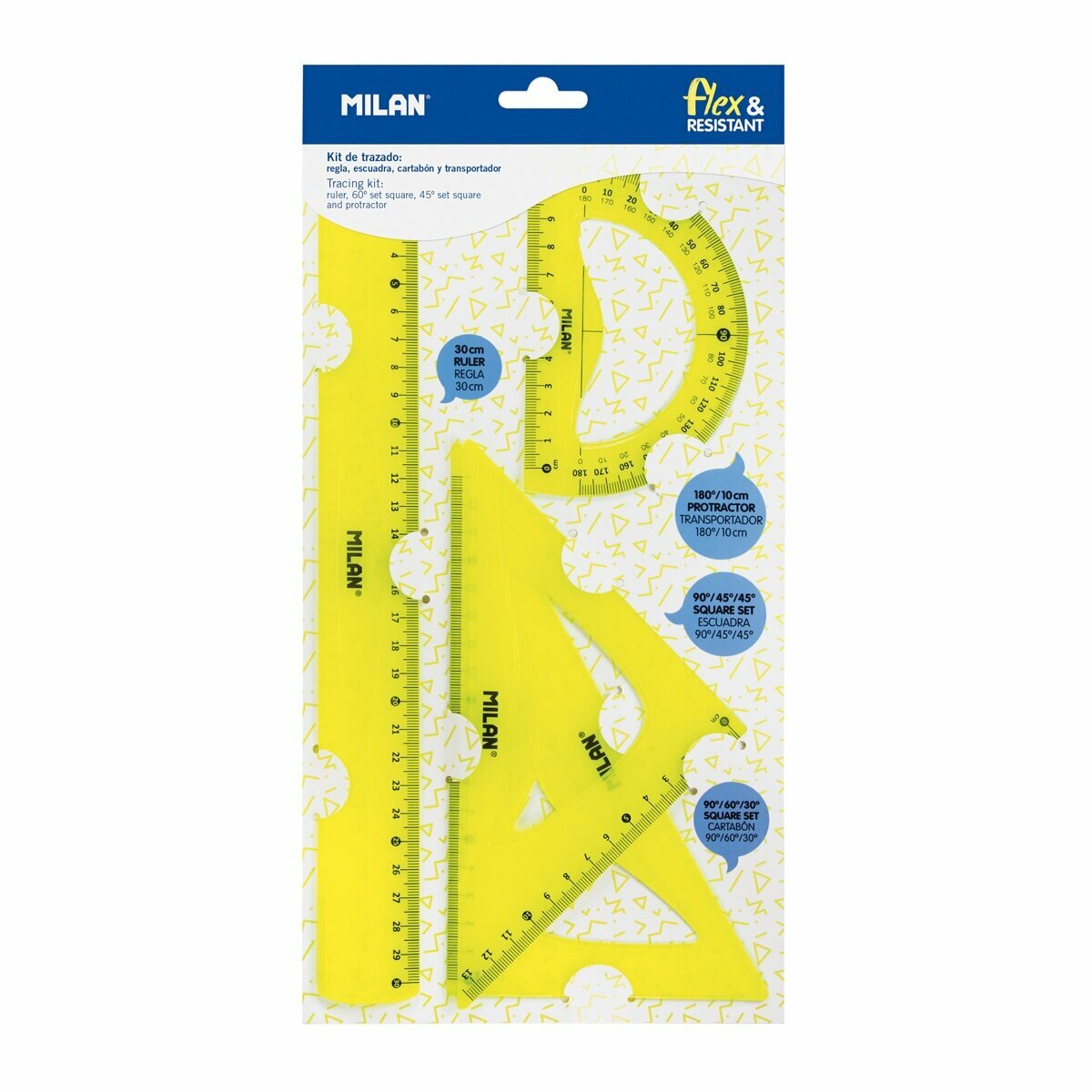Набор чертежный Milan линейка 30 см, 2 треугольника 45, 30 градусов, транспортир, желтый