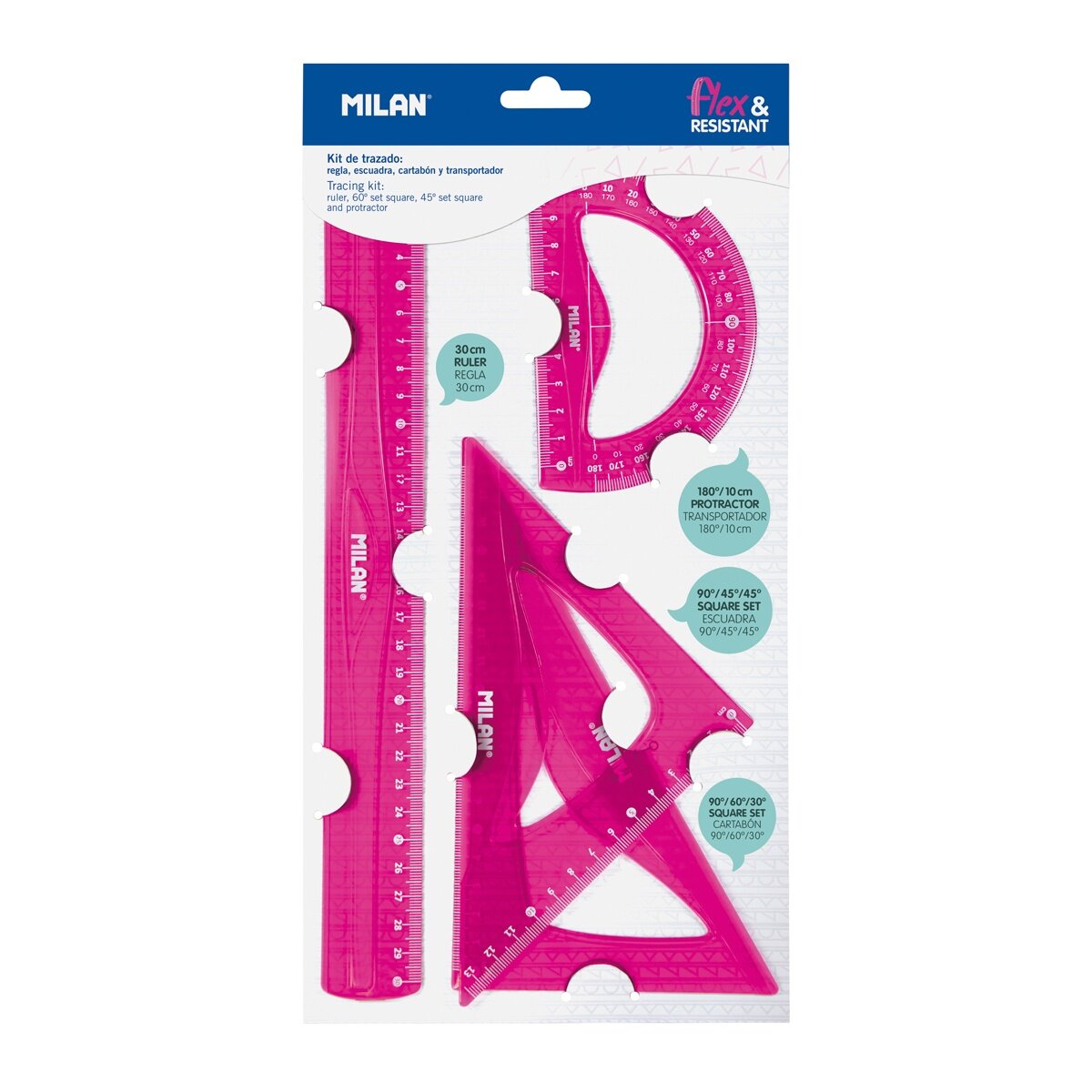 Набор линеек Milan гибких: транспортир 10 см, линейка 30 см, треугольник 13 см и 17 см, розовый (359801P)