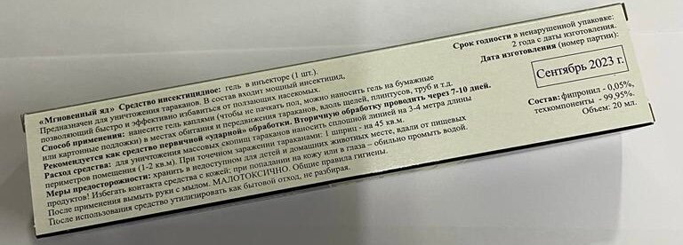 | Минусы: | Жидковат для геля, медленно действует ( тараканы исчезли через 2 месяца) |