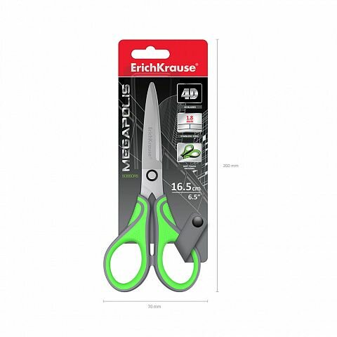 ErichKrause Ножницы 16.5 см ErichKrause Megapolis, с усовершенствованными 4D-лезвиями, не ржавеют, ручки с резиновыми вставками, в блистере