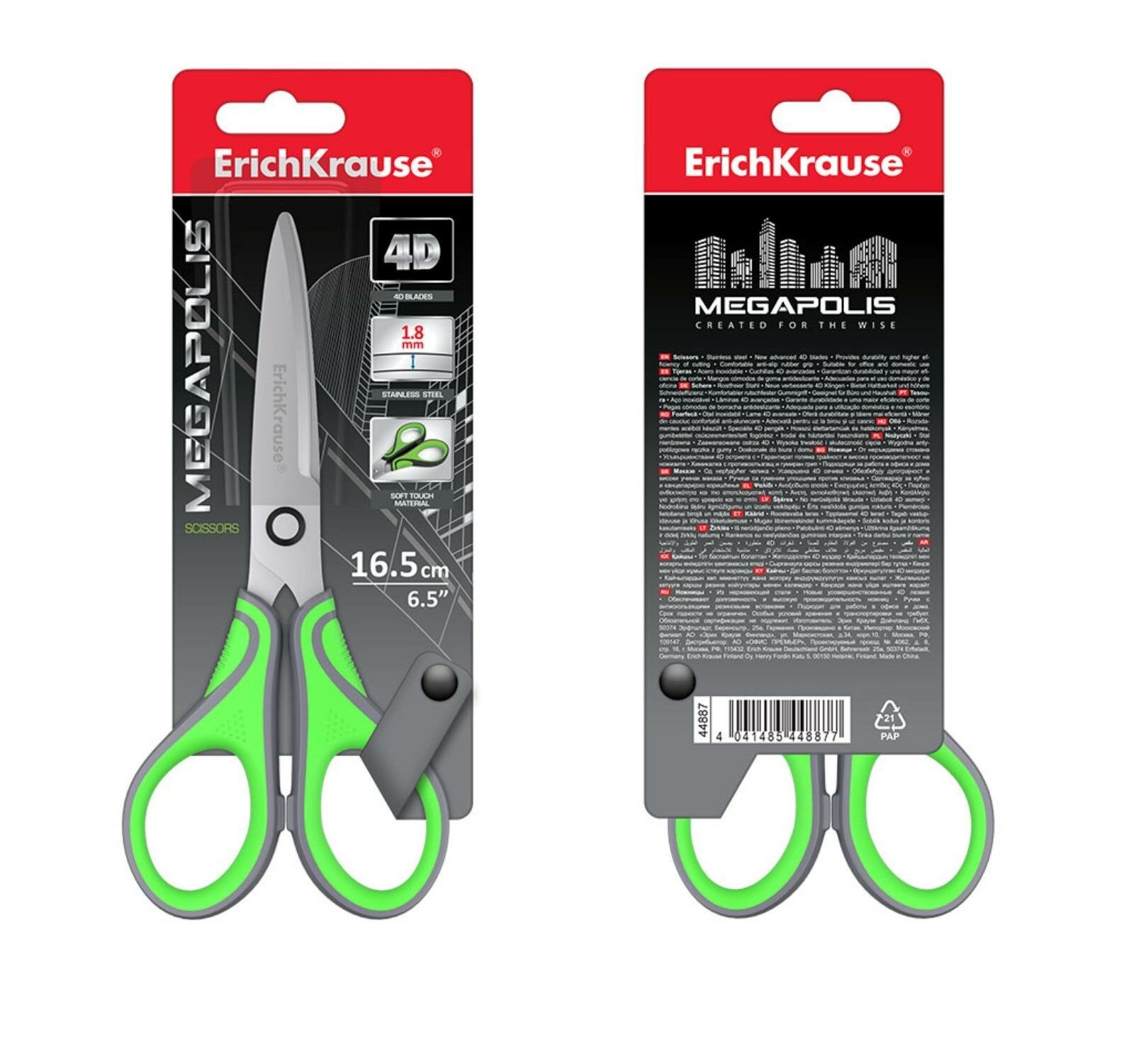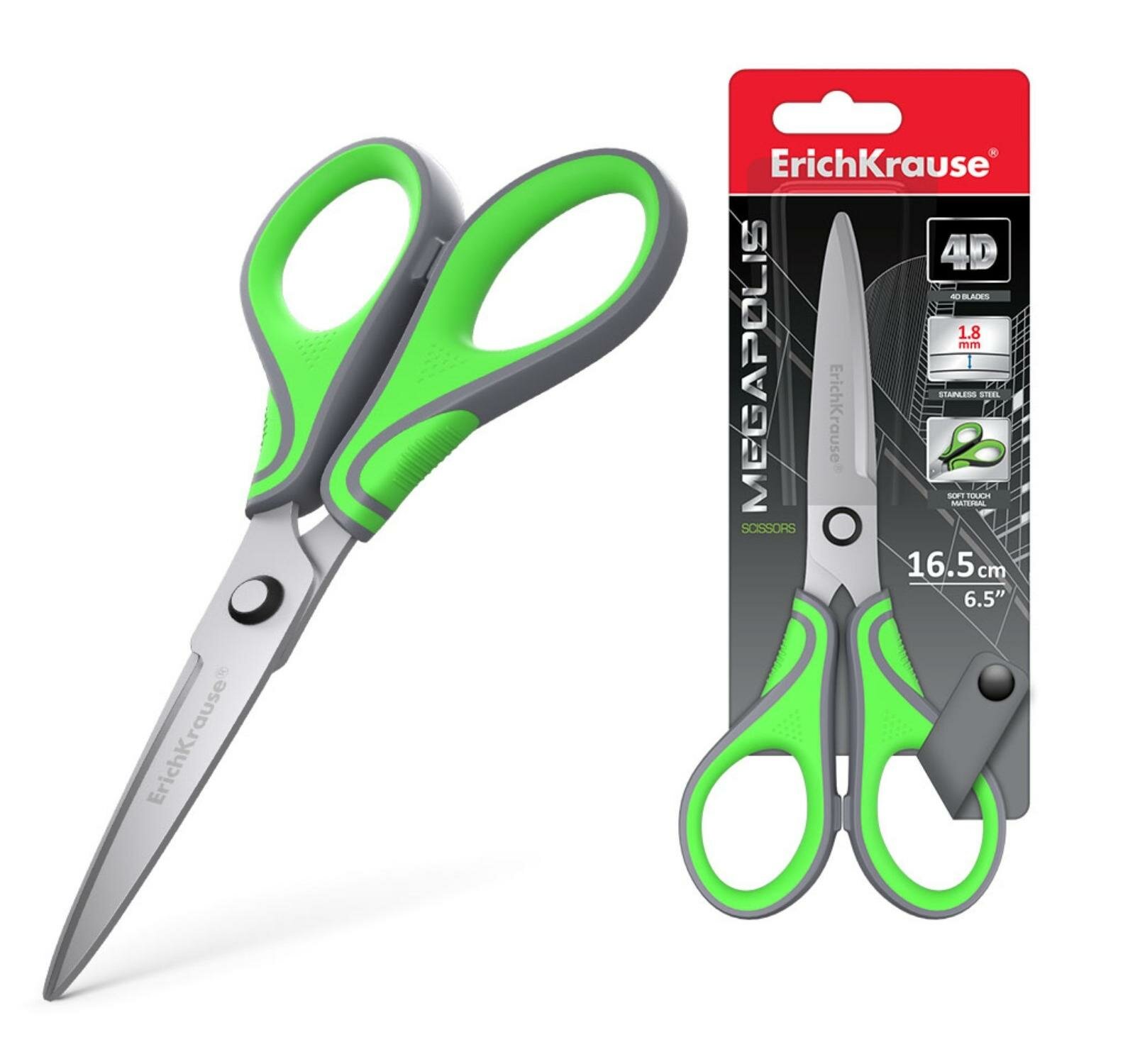 Ножницы 16.5 см ErichKrause Megapolis, с усовершенствованными 4D-лезвиями, не ржавеют, ручки с резин