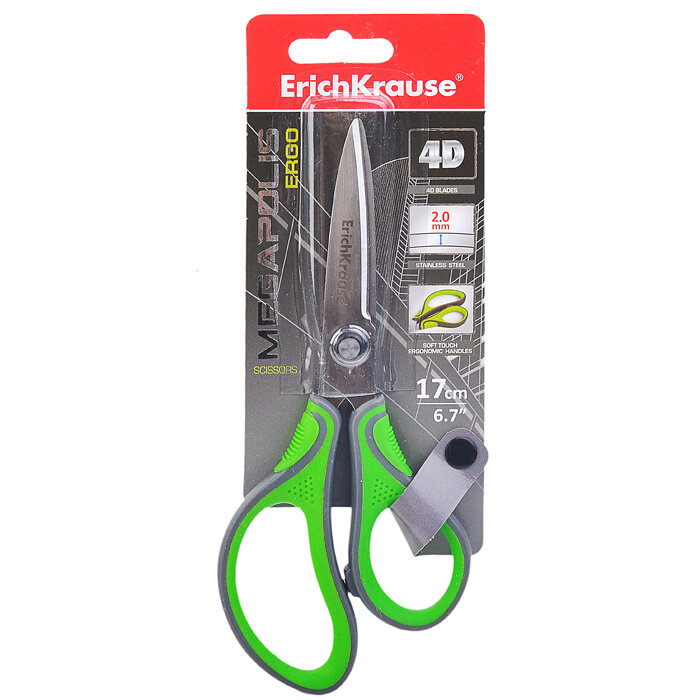 Купить ErichKrause Ножницы ErichKrause Megapolis Ergo, 17 см, с усовершенствованными 4D-лезвиями, не ржавеют, ручки с резиновыми вставками, в блистере