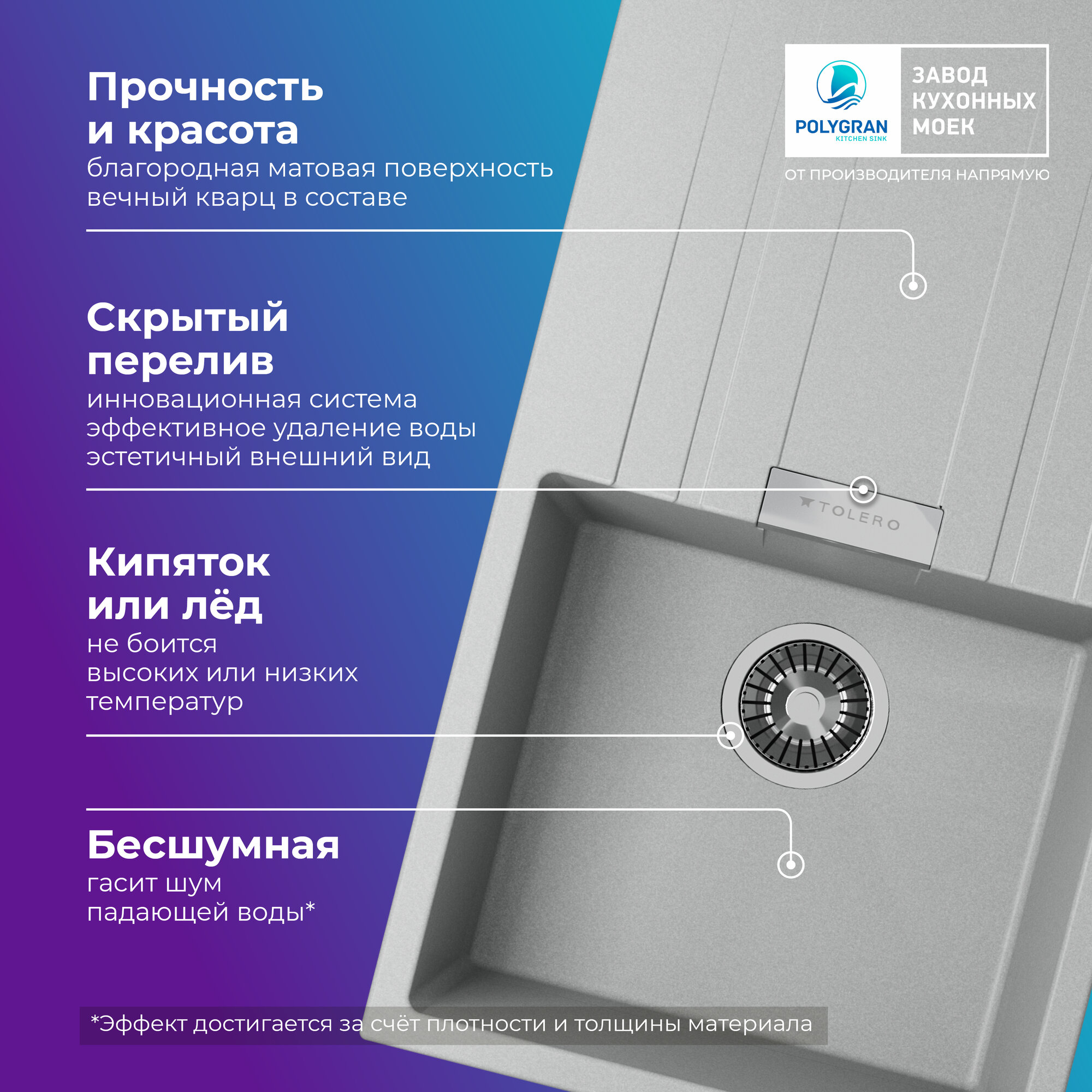 СохранитьМойка для кухни кварцевая с крылом TOLERO Loft TL-750 серая (Платина) интересное: