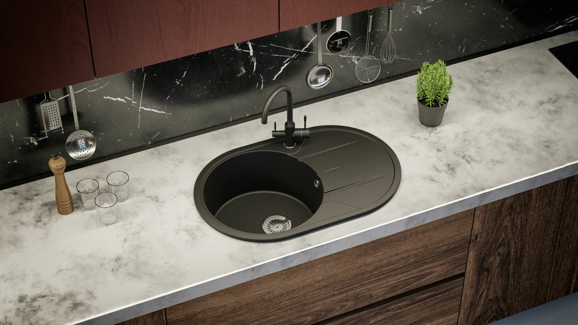 Мойка для кухни кварцевая овальная TOLERO Classic R-116 черная (Уголь)