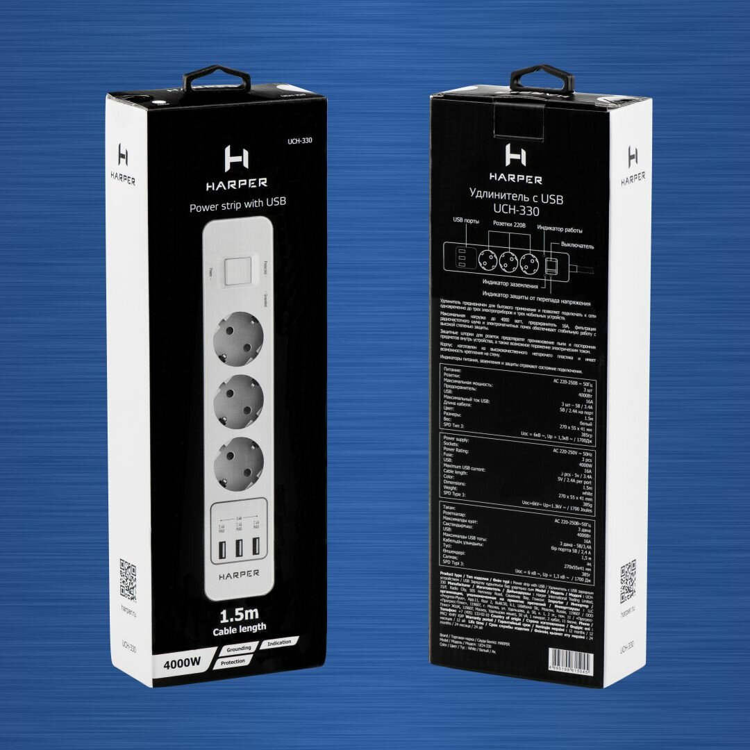 Harper Сетевой фильтр с USB зарядкой UCH-330 White (3 роз.,1,5м., 3 x USB (max 3.4A), 4000W) (H00002263)