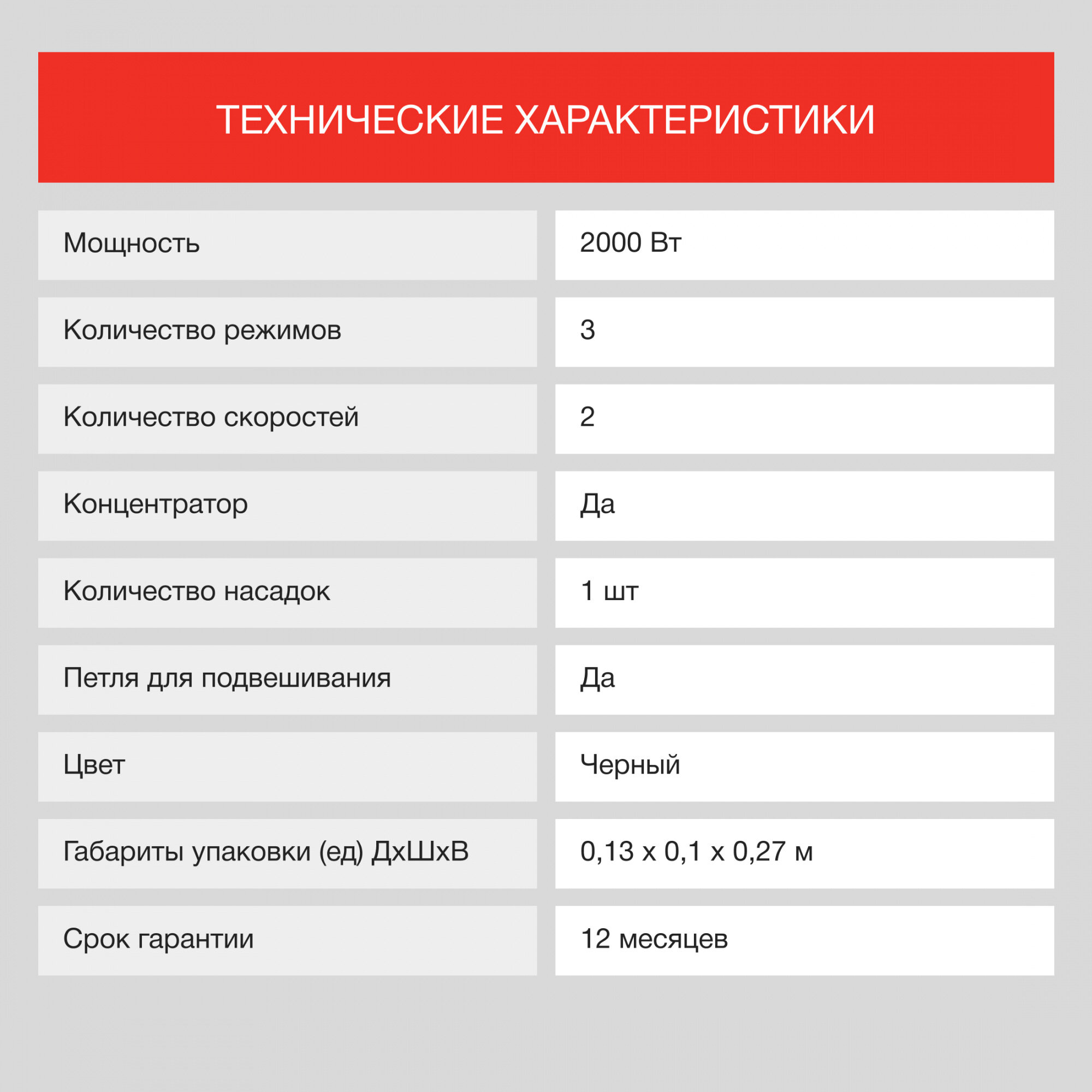 | Плюсы: | Регулируется и мощность потока, и температура. Узкое сопло у концентратора. Качественная сборка, необычный дизайн. Длинный шнур с петелькой для подвешивания. |